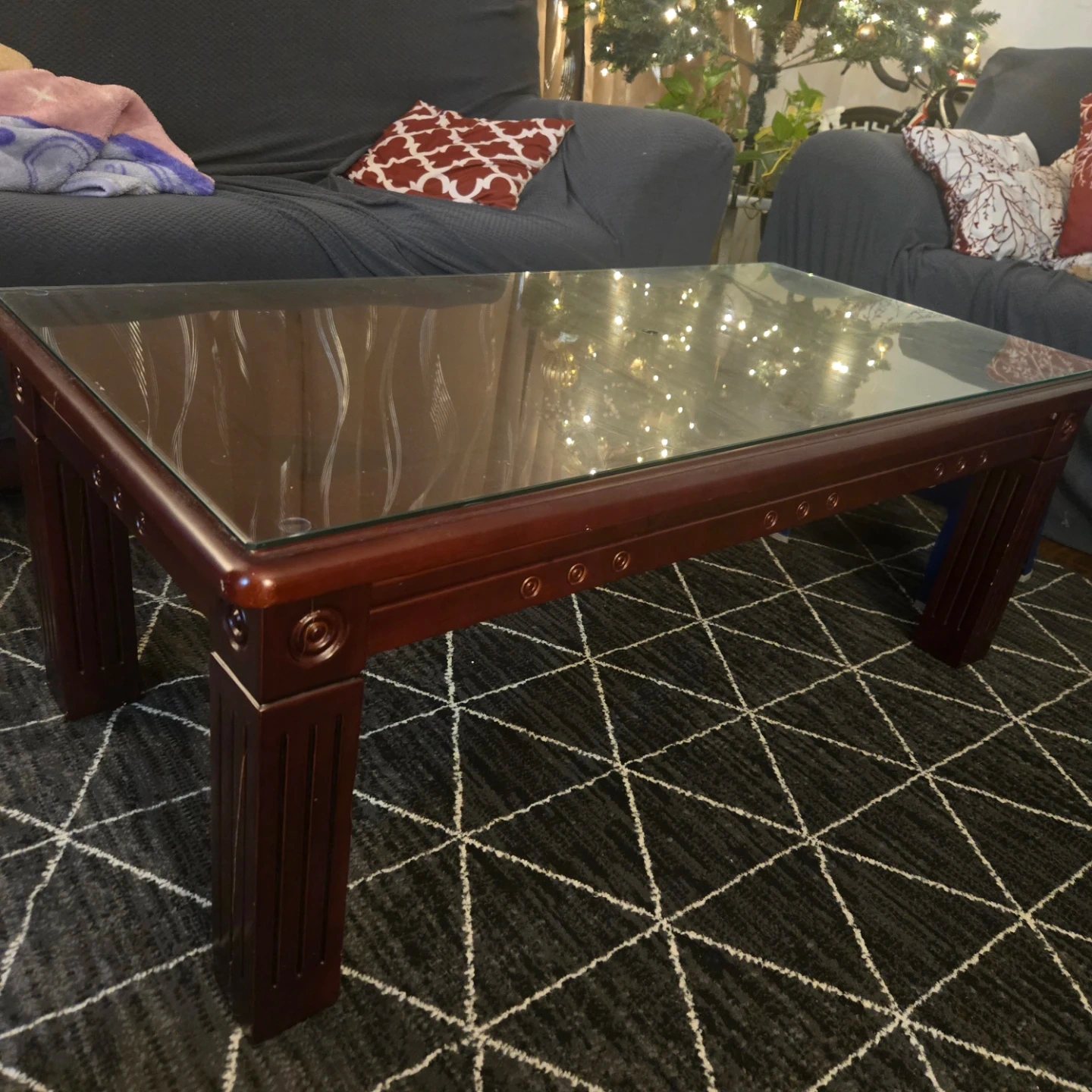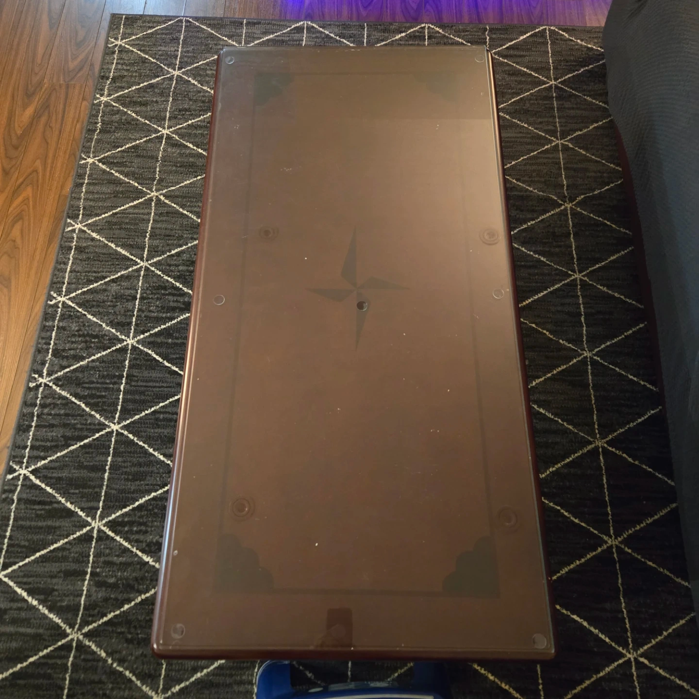 Selling a glass top centre table with a dark wood frame. It's in good condition and would be a great addition to any living room!