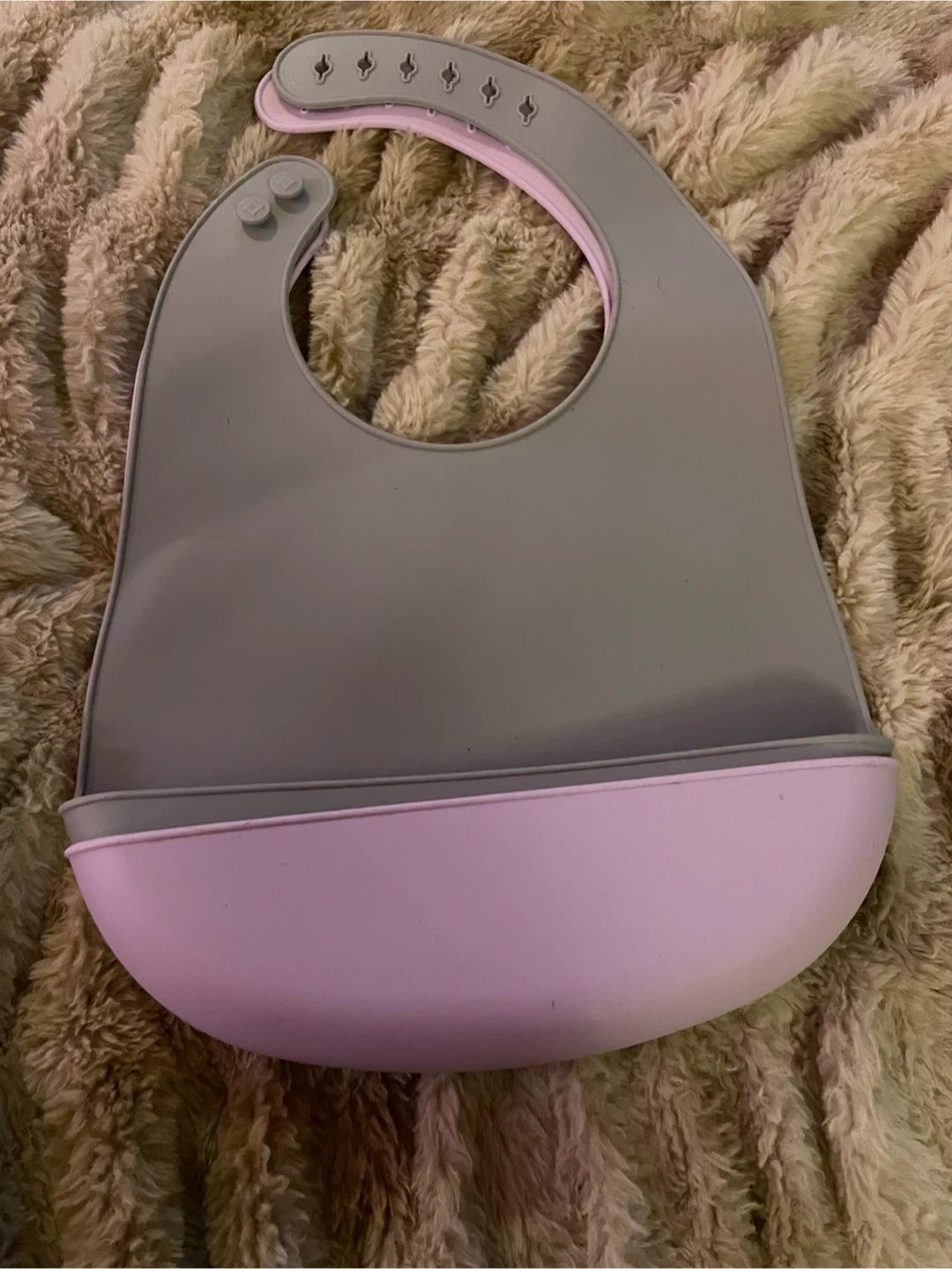 Selling a cute silicone baby bib in a lovely grey and lavender colour combo! It's in great condition and ready to catch all those little spills and messes. Perfect for babies and toddlers!