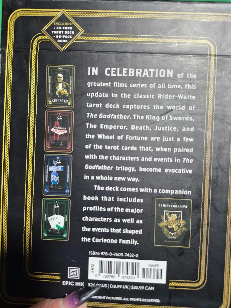Selling The Godfather Tarot card deck, which includes a 78-card tarot deck and a book on the Corleone family and its history. The deck comes with a companion book that includes profiles of the major characters as well as the events that shaped the Corleone Family. The original price was $26.00 US/$18.99 UK/$35.99 CAN. Its been opened but never used #Cleanout..
