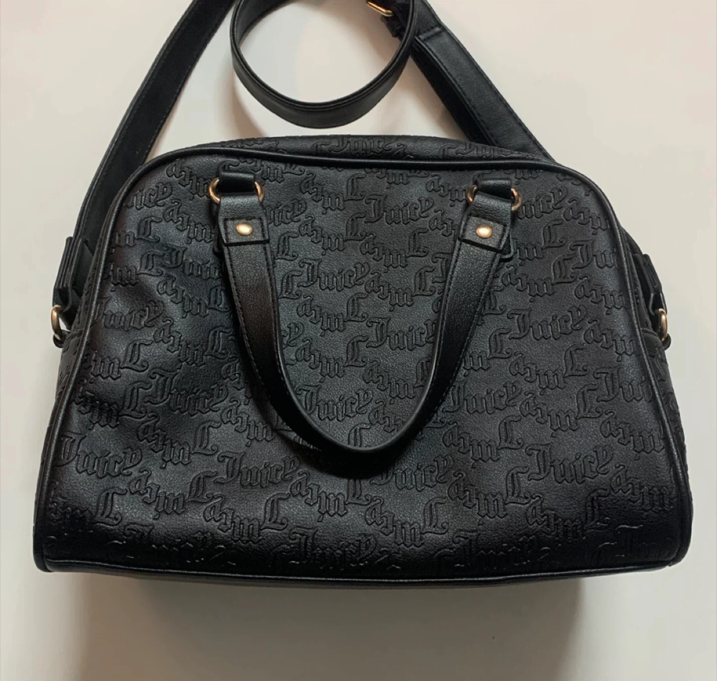 Selling a cute Juicy Couture satchel! It's black with an embossed Juicy Couture pattern all over. The interior lining also features the Juicy Couture logo. It has both handles and a shoulder strap for easy carrying.