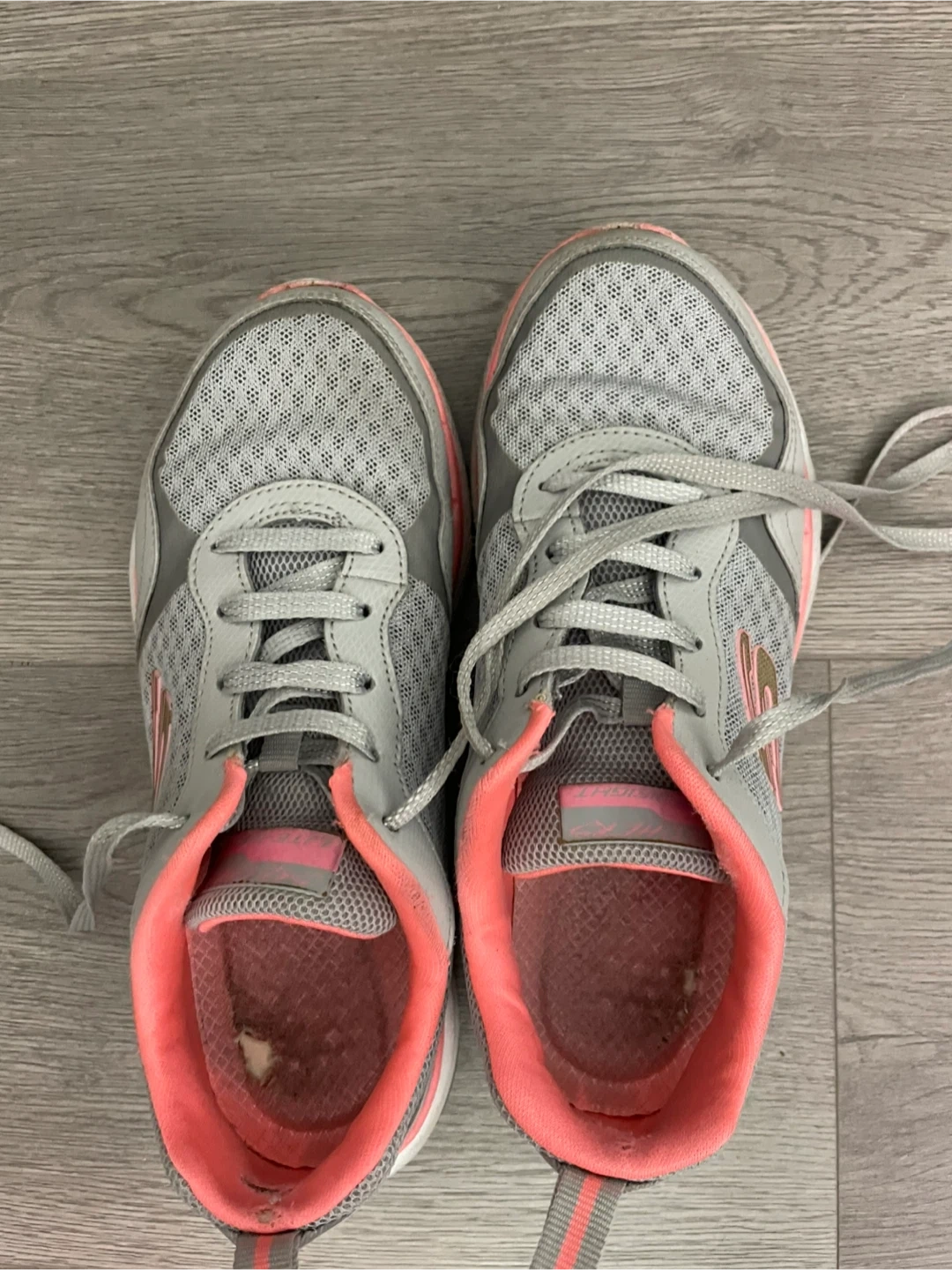 Selling a pair of Skechers running shoes in grey and pink. They have been used, as you can see from the photos. But still have a lot of life left. Size / women 5