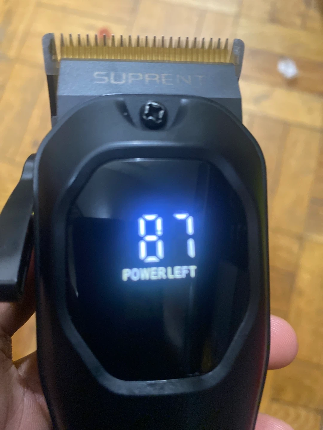 Selling a Suprent hair clipper, model A92225. It shows the power left on a digital display. It's in great condition and comes wit box and guards