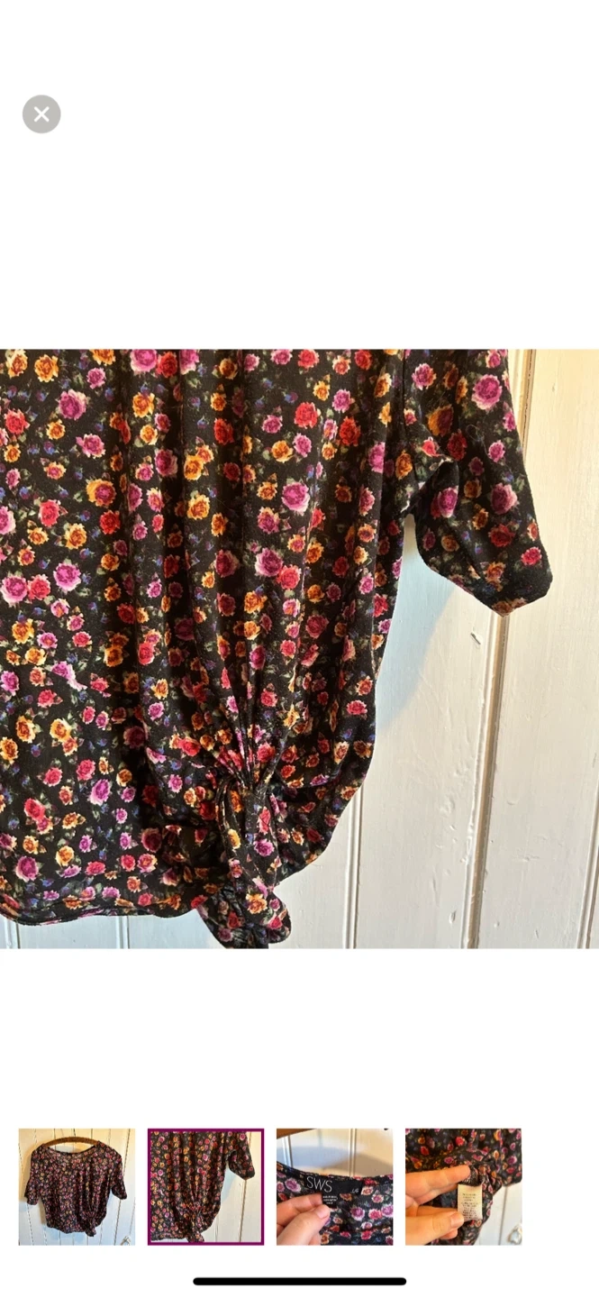 SWS brand. Short sleeve fix twist knot top. Black with pink & orange colored floral. Size large. Like new condition, light wash wear.