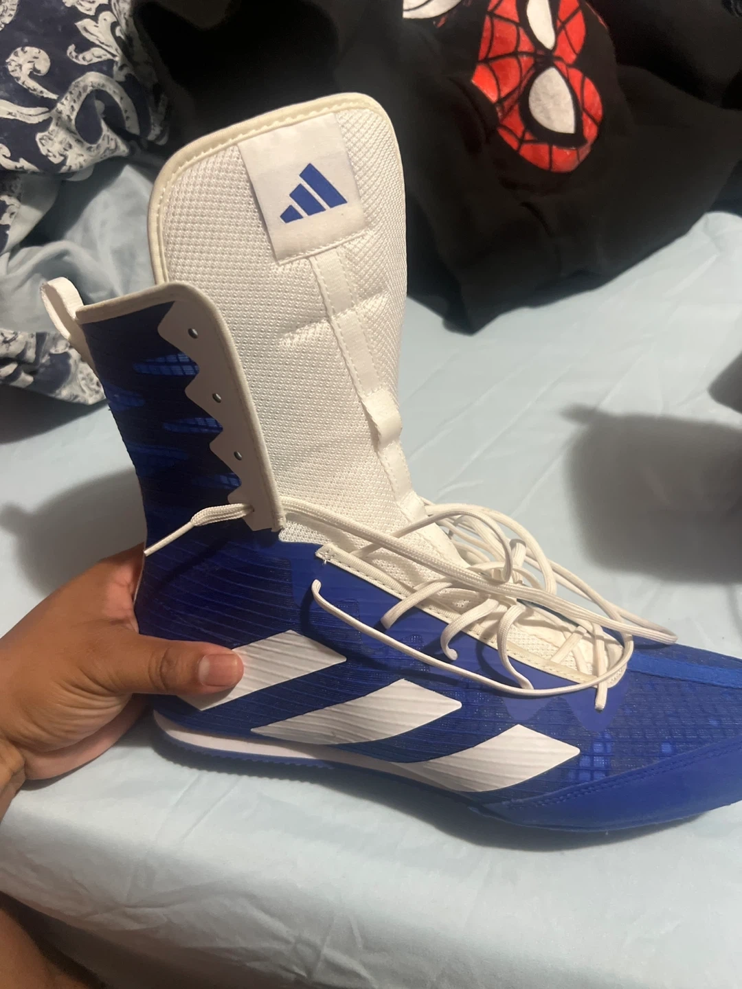 Selling a pair of Adidas boxing shoes in blue and white. Size US 10. I only used them for a few rounds and I did use it outside once but they are still good