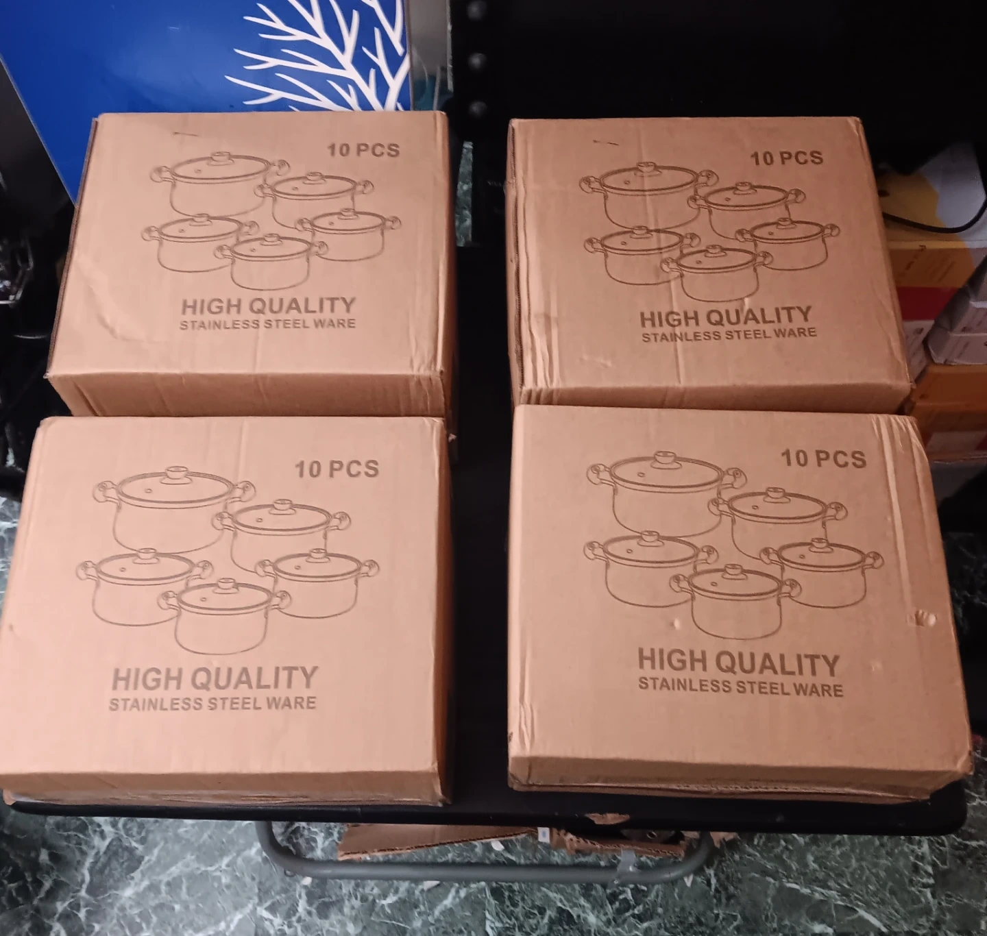 high-quality stainless steel non-stick cookware set! This set includes 10 pieces of durable and versatile cookware, perfect for any kitchen. The set comes in its original box, ready to use or gift. If you're interested, feel free to message me!