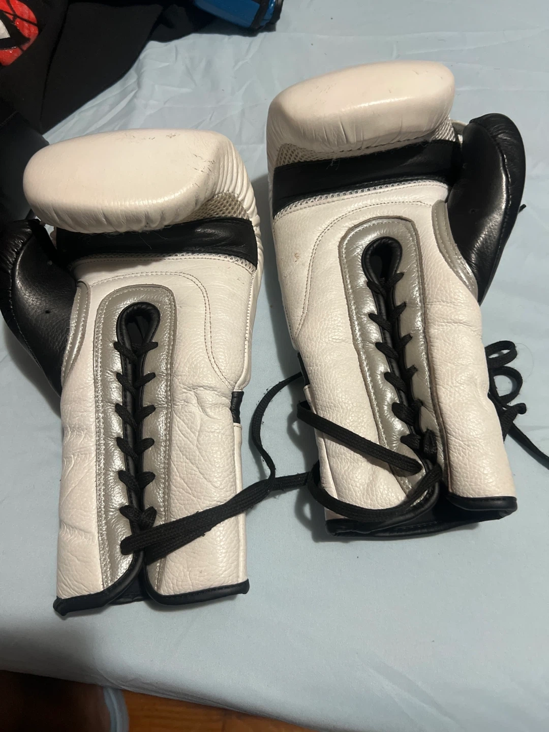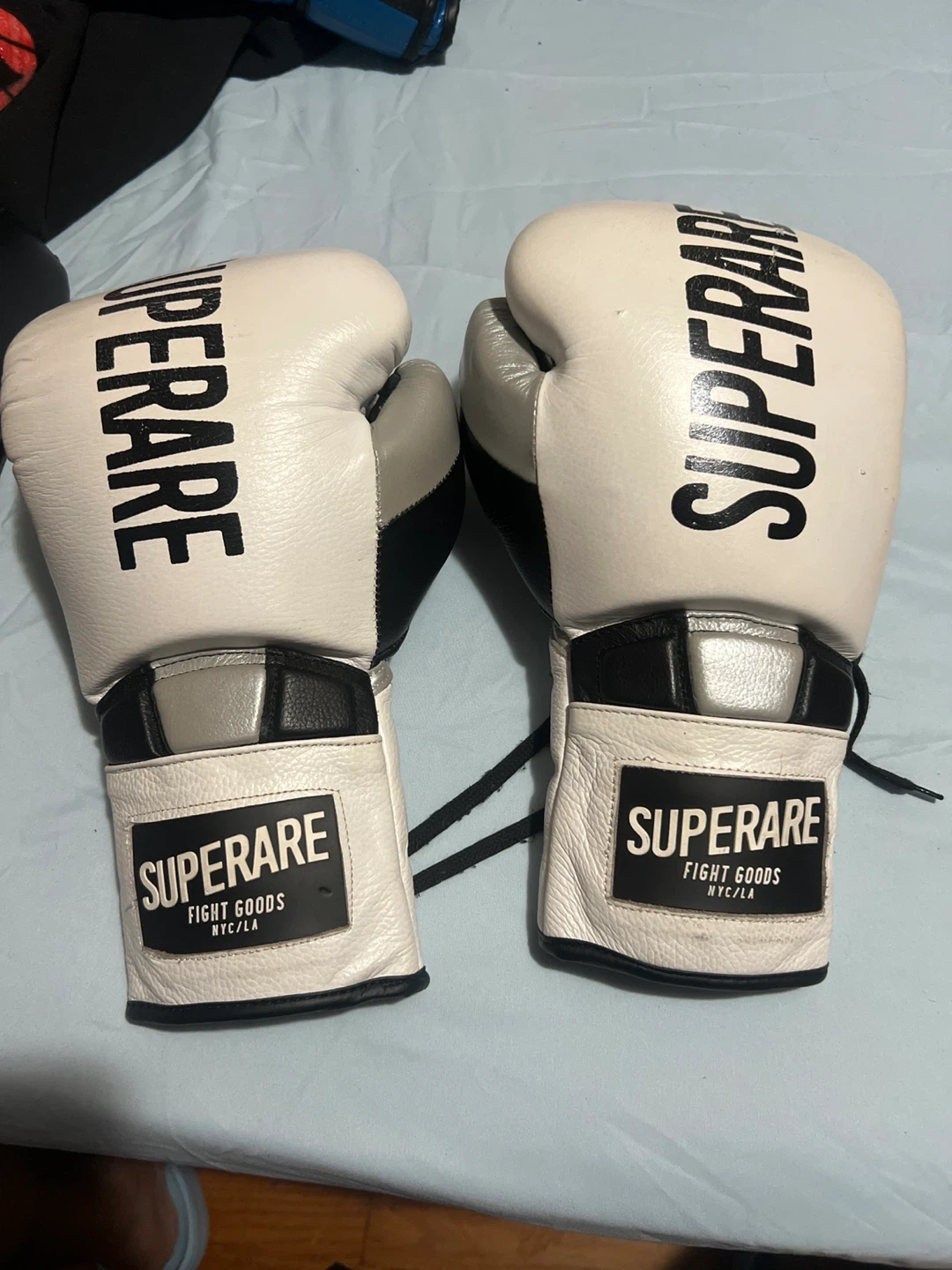 Selling a pair of Superare boxing gloves in white and black. They're in good condition and ready for your next training session. These gloves are perfect for sparring or hitting the heavy bag.