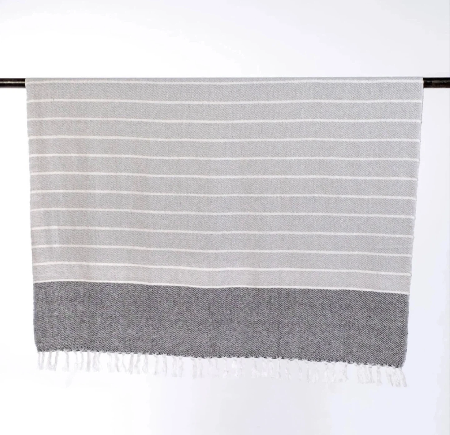 Cozy Simons Maison throw blanket for sale! It features a lovely grey and white striped pattern. Perfect for adding a touch of warmth and style to your home