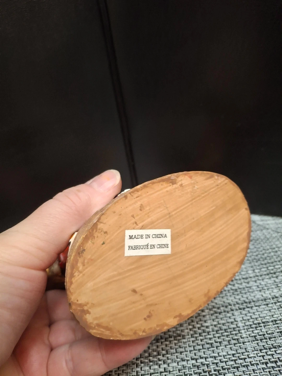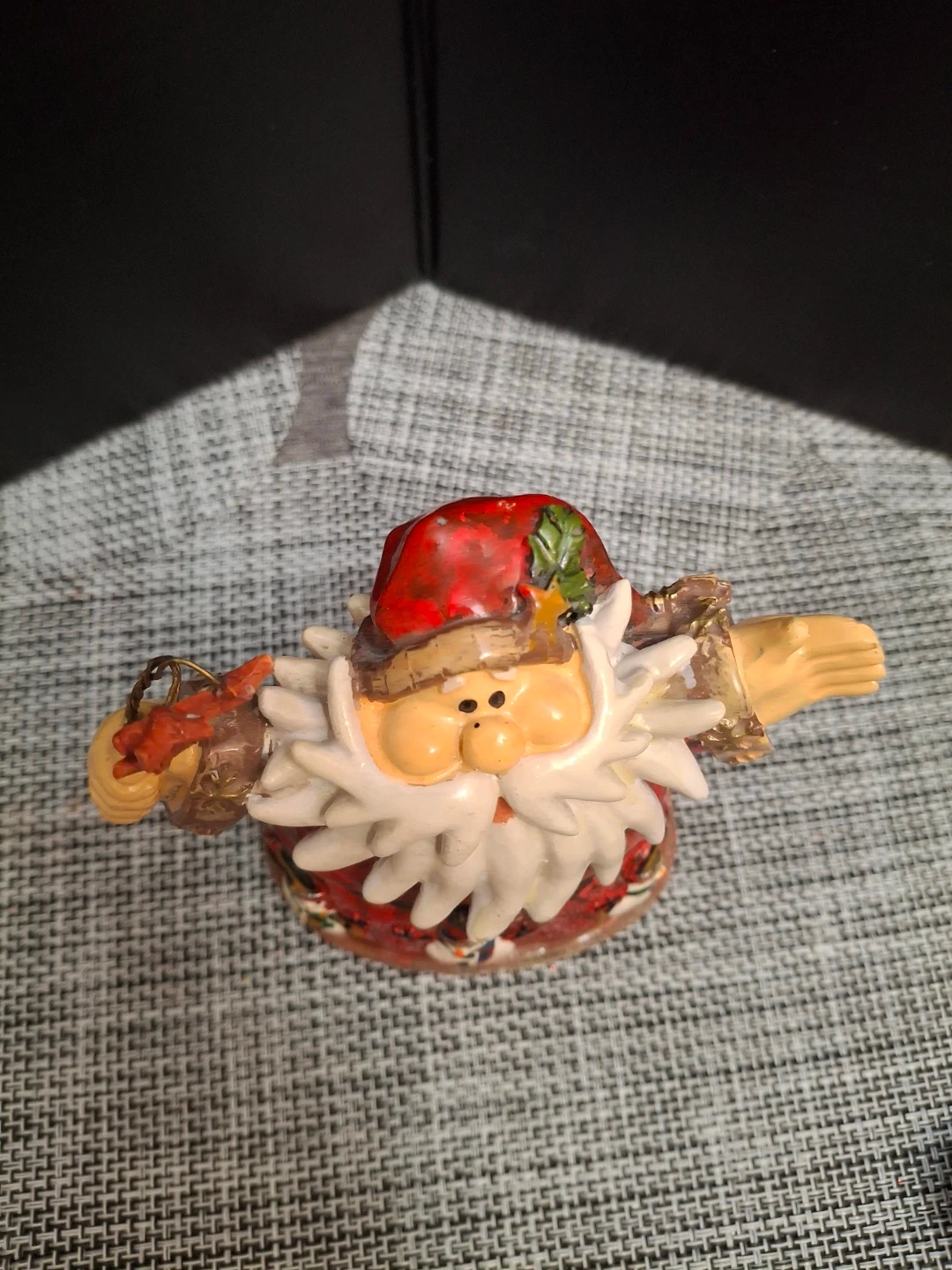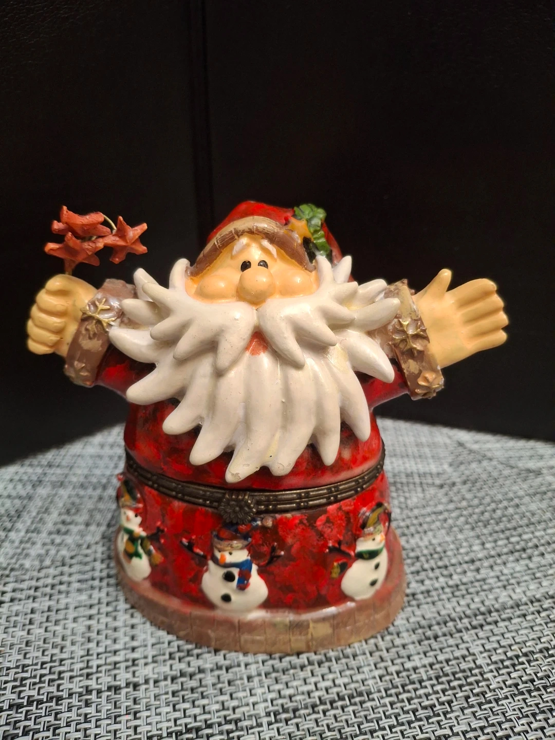 A cute Santa Claus trinket box, perfect for storing small items or as a decorative piece. It's in great condition and features a festive design with snowmen around the base. Made in China.
