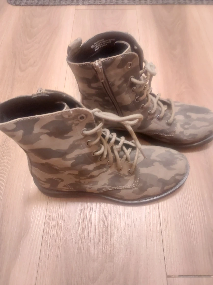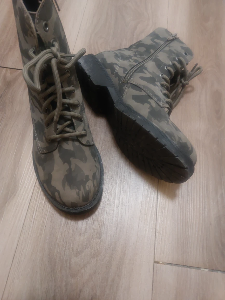 Here are some cool camo ankle boots! They're lace-up with a side zipper for easy on and off. Perfect for adding a bit of edge to your outfit