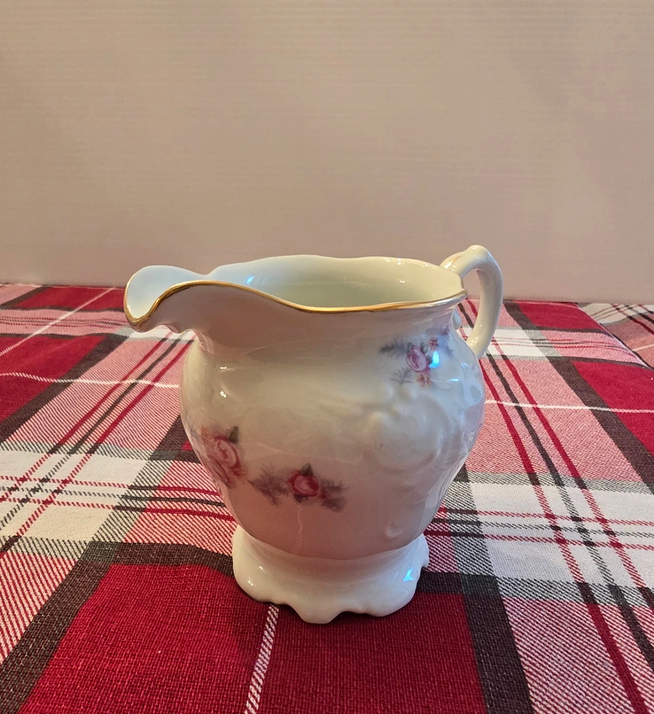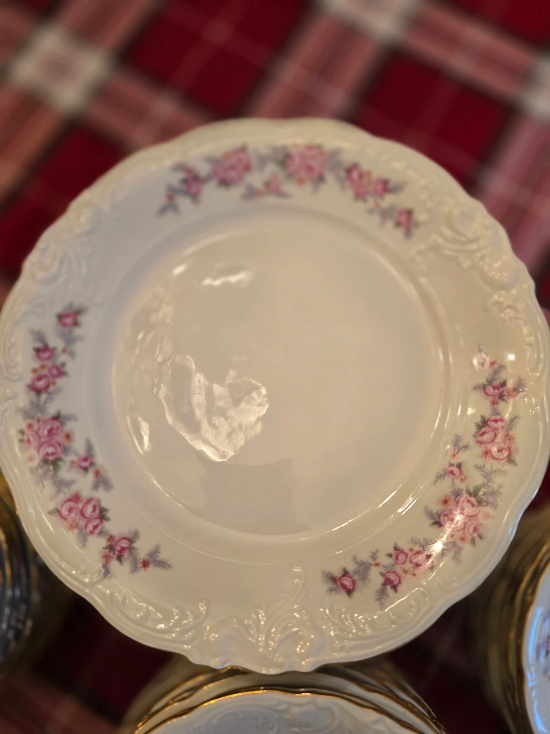 Walbrzych/Wawel vintage fine china porcelain made in Poland. 75 piece, setting for 12, pink rose garland, embossed scrolls with gold trim. This will make a beautiful addition to any table setting for the holidays. Set stored in a china cabinet, no chips or cracks-excellent condition.