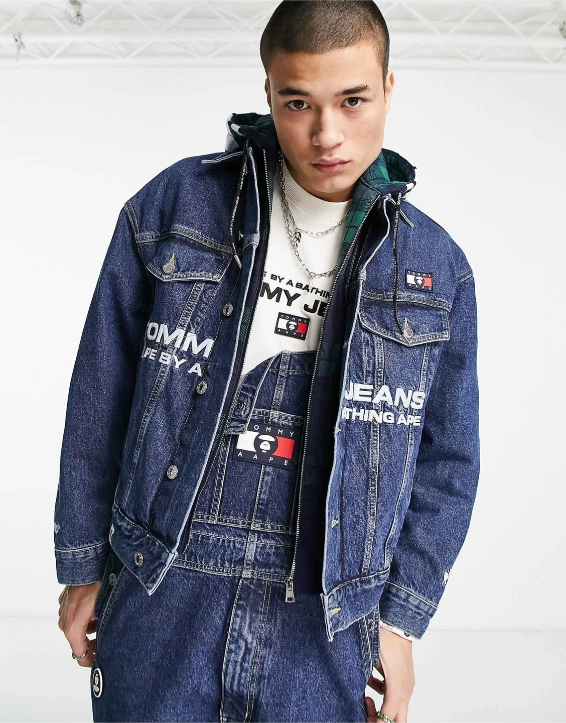 Selling a Tommy Jeans AAPE denim jacket in size small. The jacket features a unique design with Tommy Jeans and AAPE branding. The hood has a plaid pattern. Perfect for adding a stylish touch to your wardrobe!