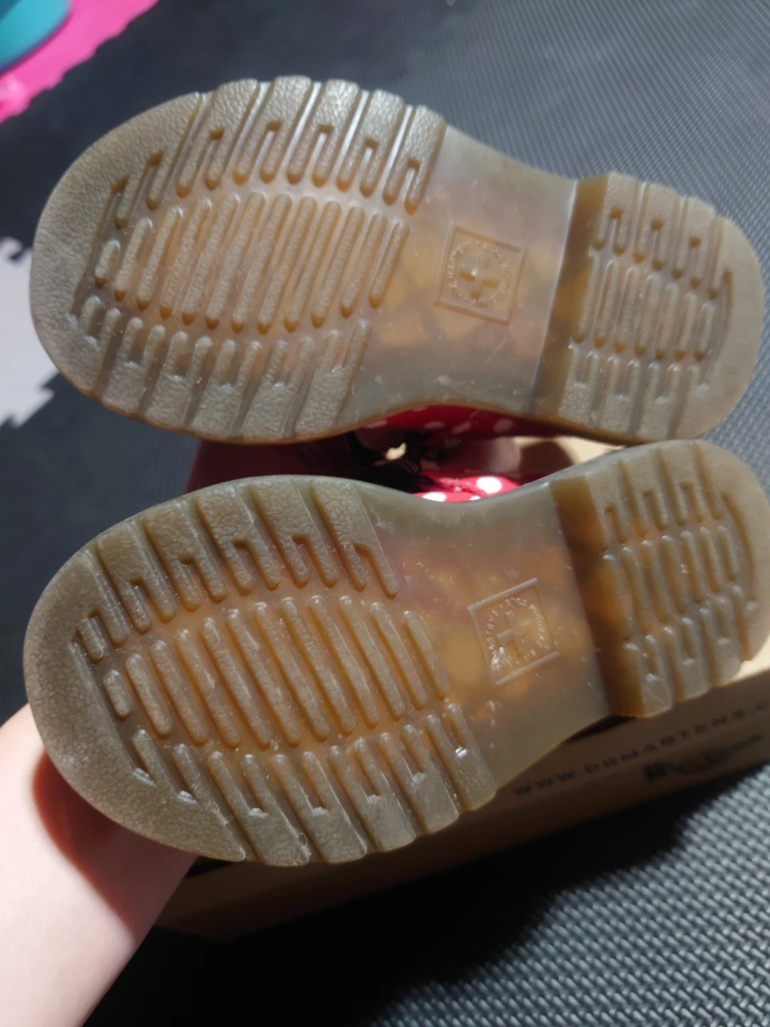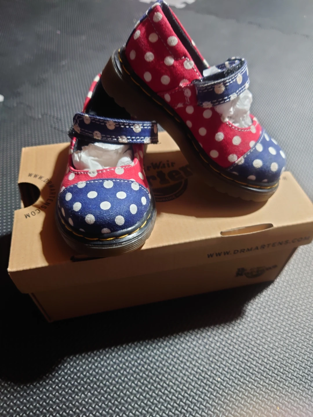 These adorable Dr. Martens Bairn shoes are in a navy, white, and red polka dot canvas! They're a US size 6 for kids and come with the original box