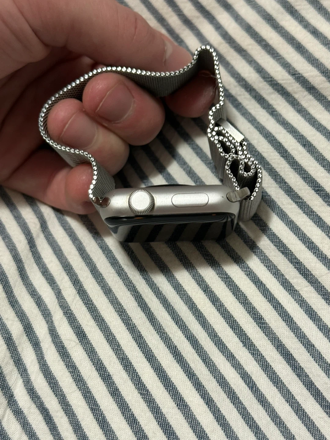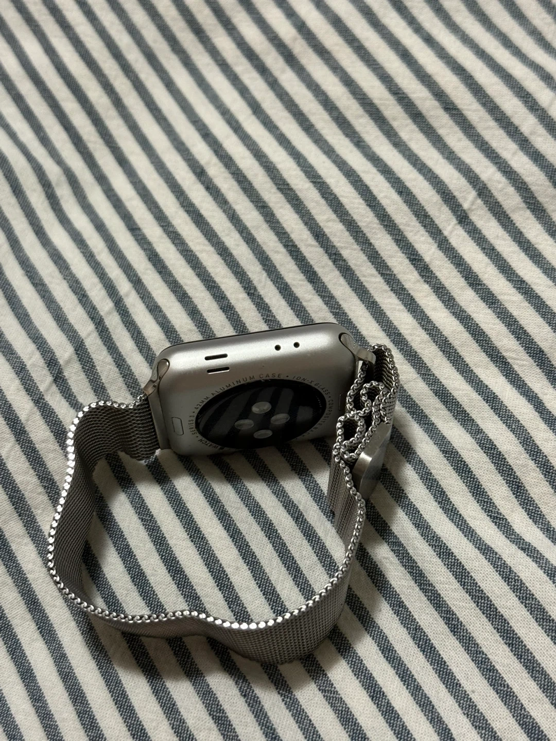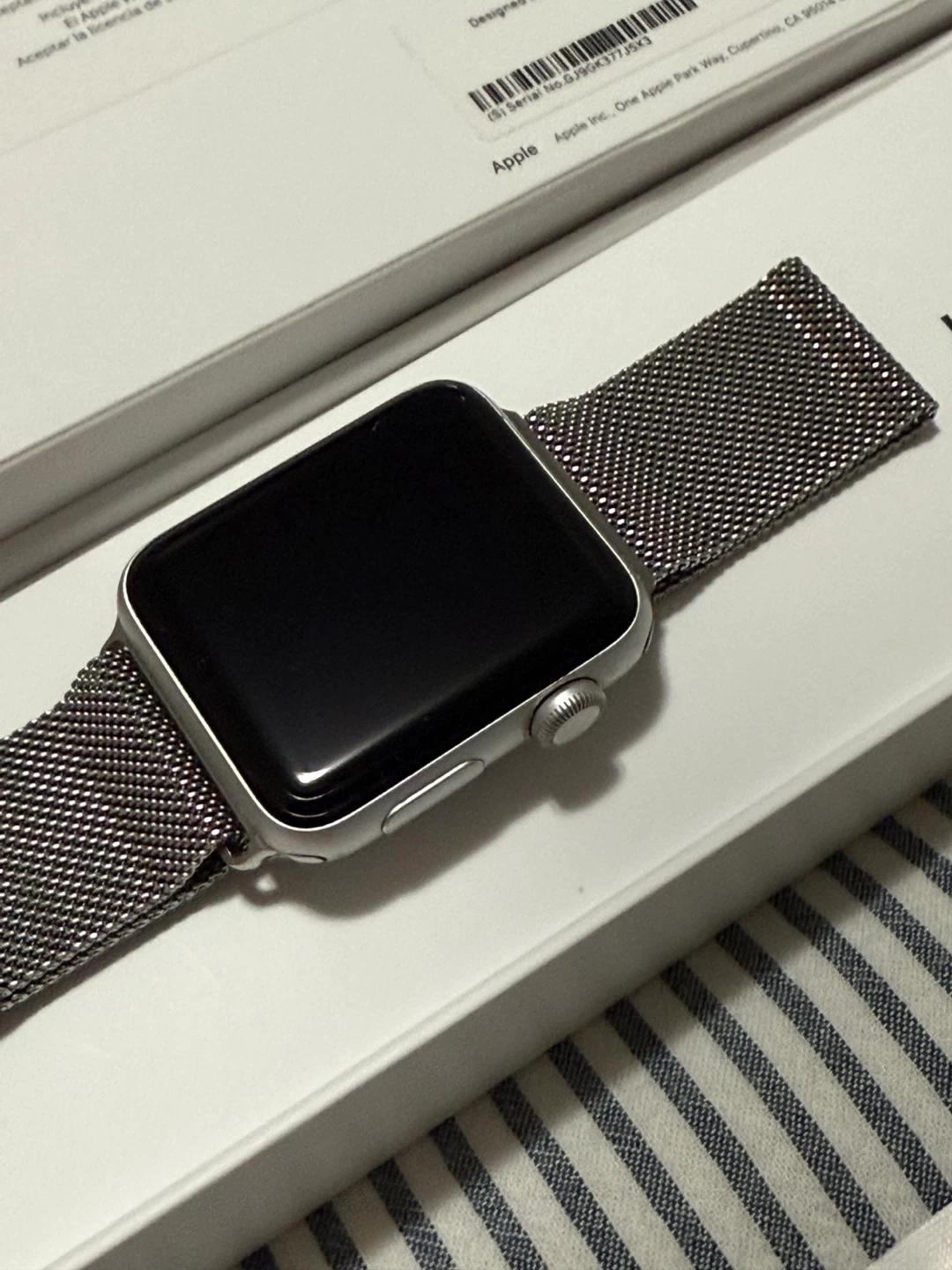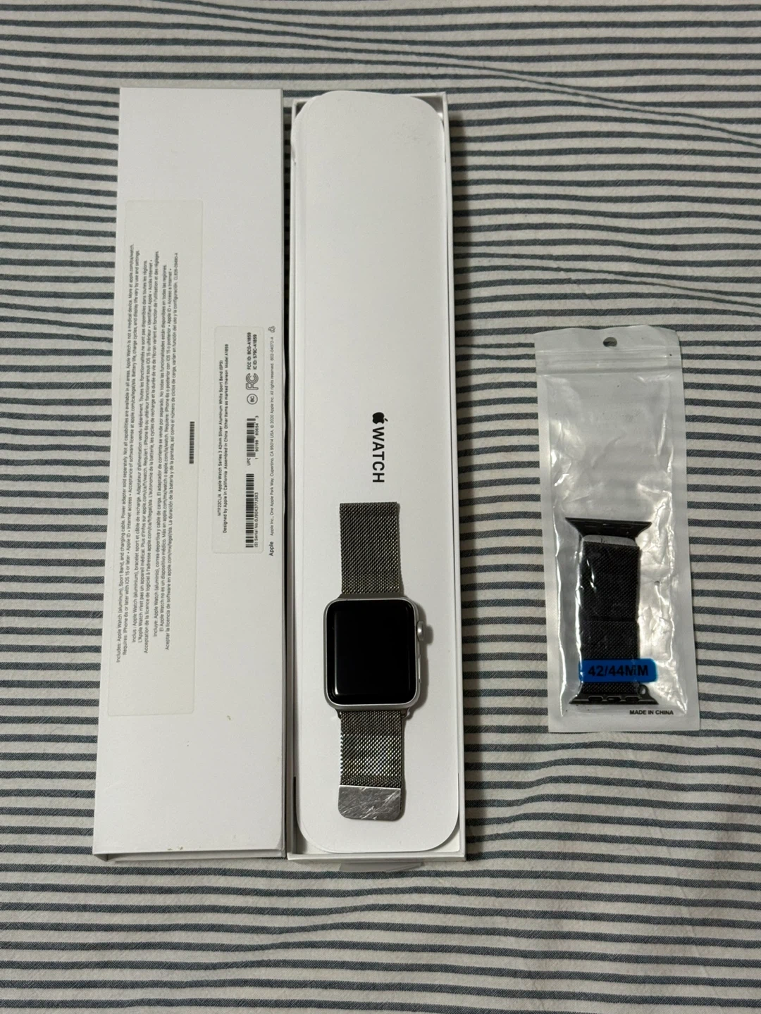 Selling an Apple Watch with a silver band, compatible with 42mm and 44mm sizes. It comes with the original box and an additional black band. Great condition! Worn to the gym only a dozen times, max. Basically brand new