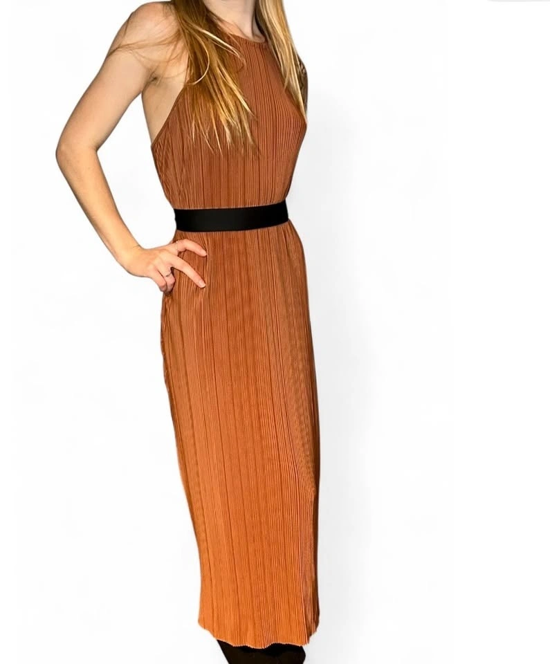 pleated burnt orange midi dress with keyhole back & bottom slit