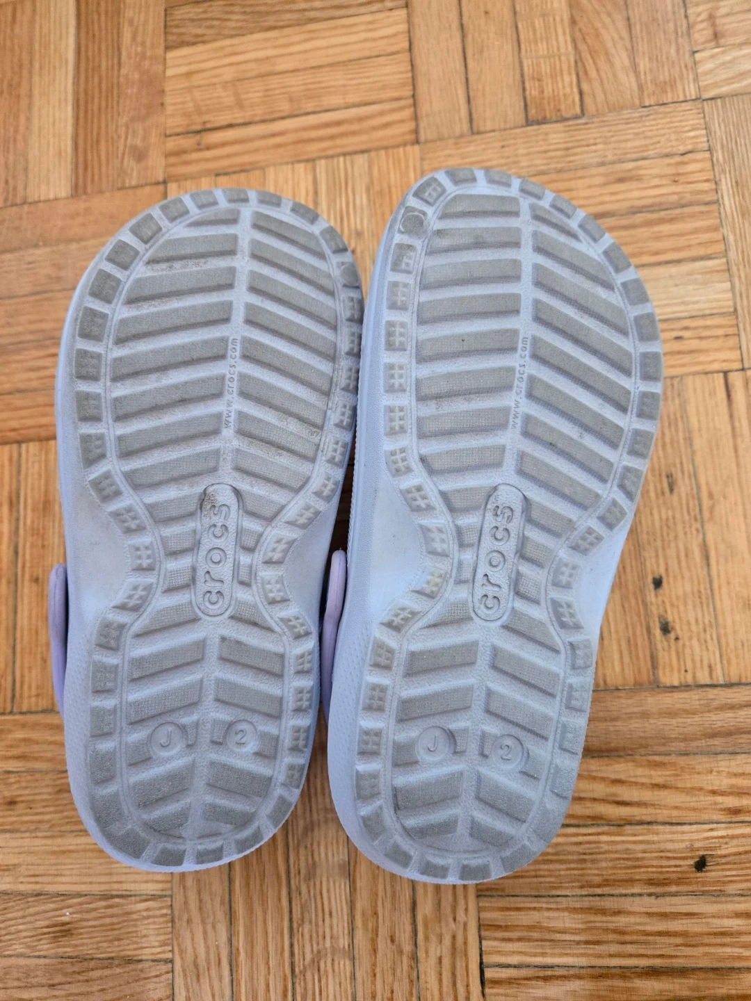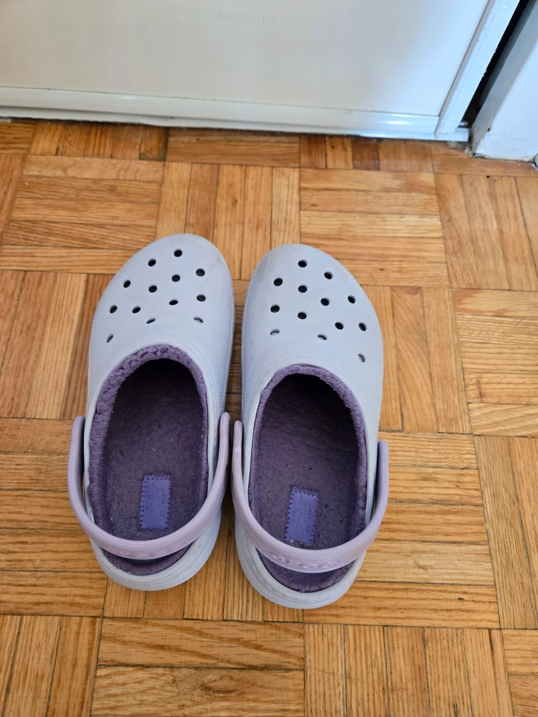 Selling a pair of Crocs Kids' Baya Lined Clogs in size J2. These are a light purple colour with a furry purple lining. Perfect for keeping little feet warm and comfy!