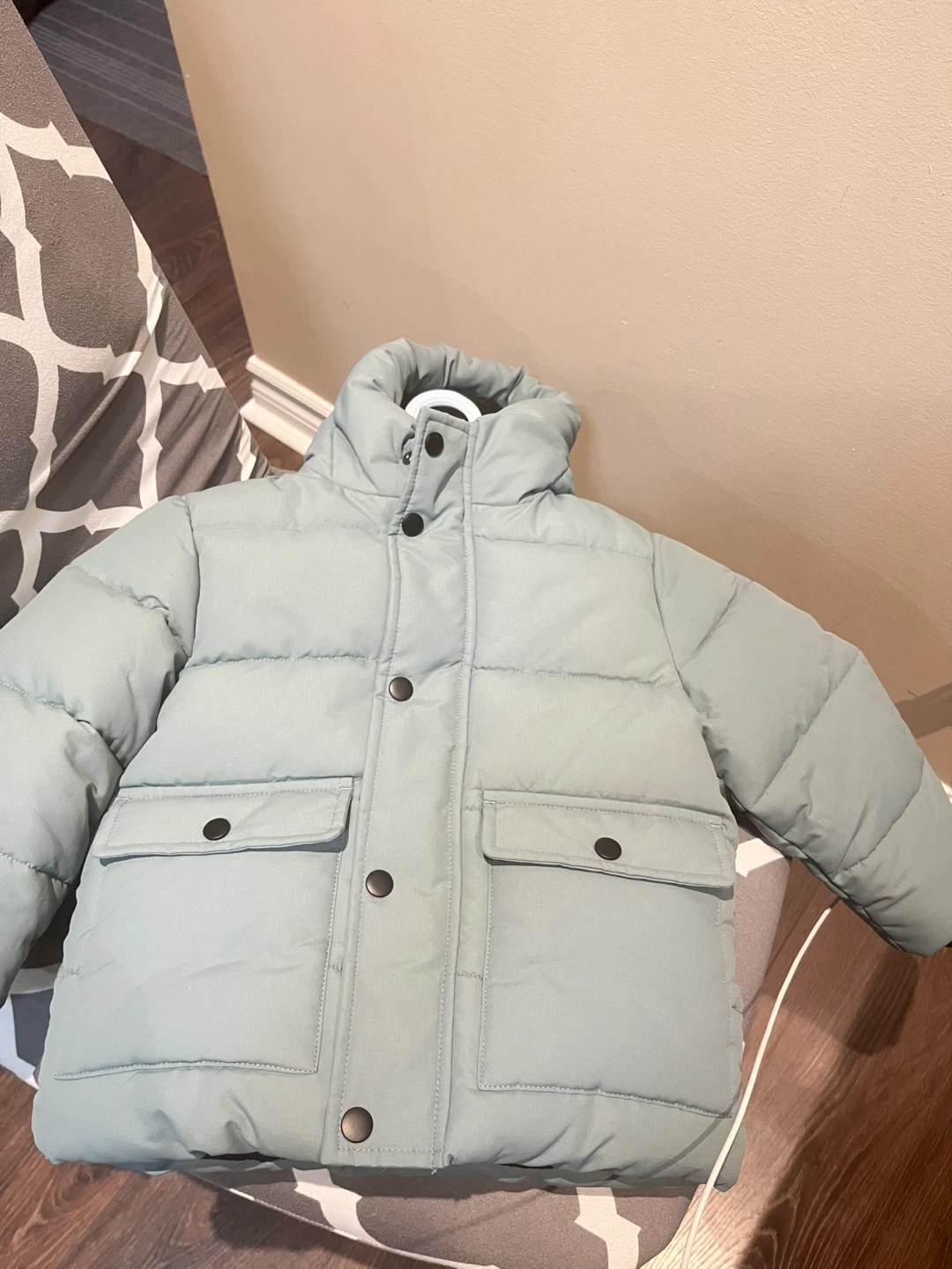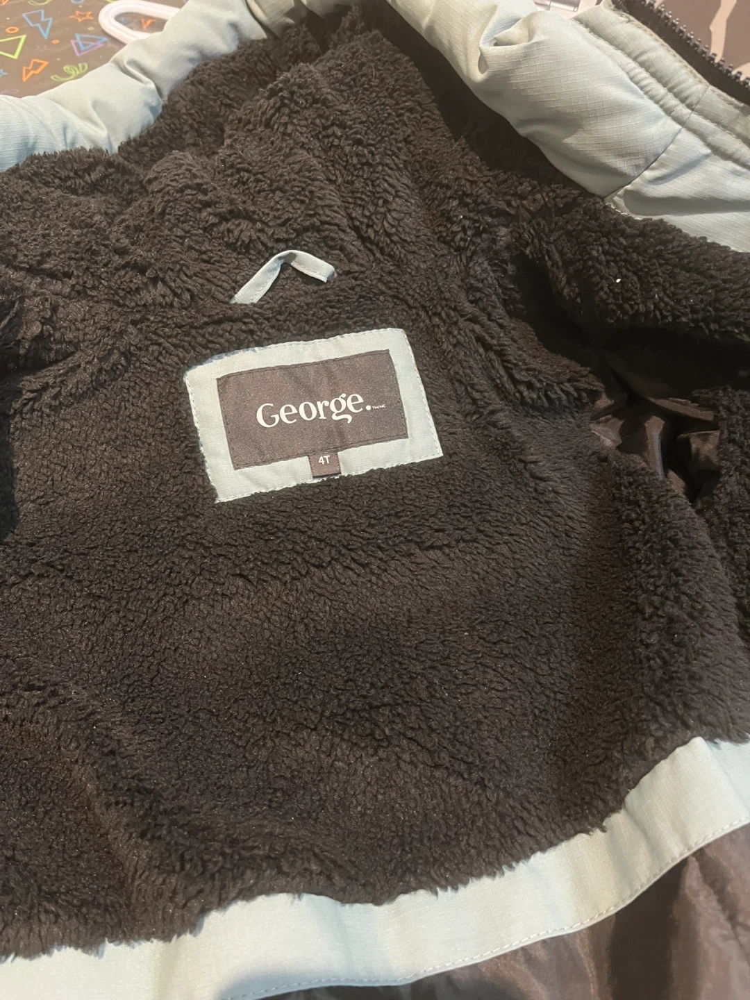 Here's a George brand puffer jacket in size 4T. It's a light blue colour and has a cozy black fleece lining