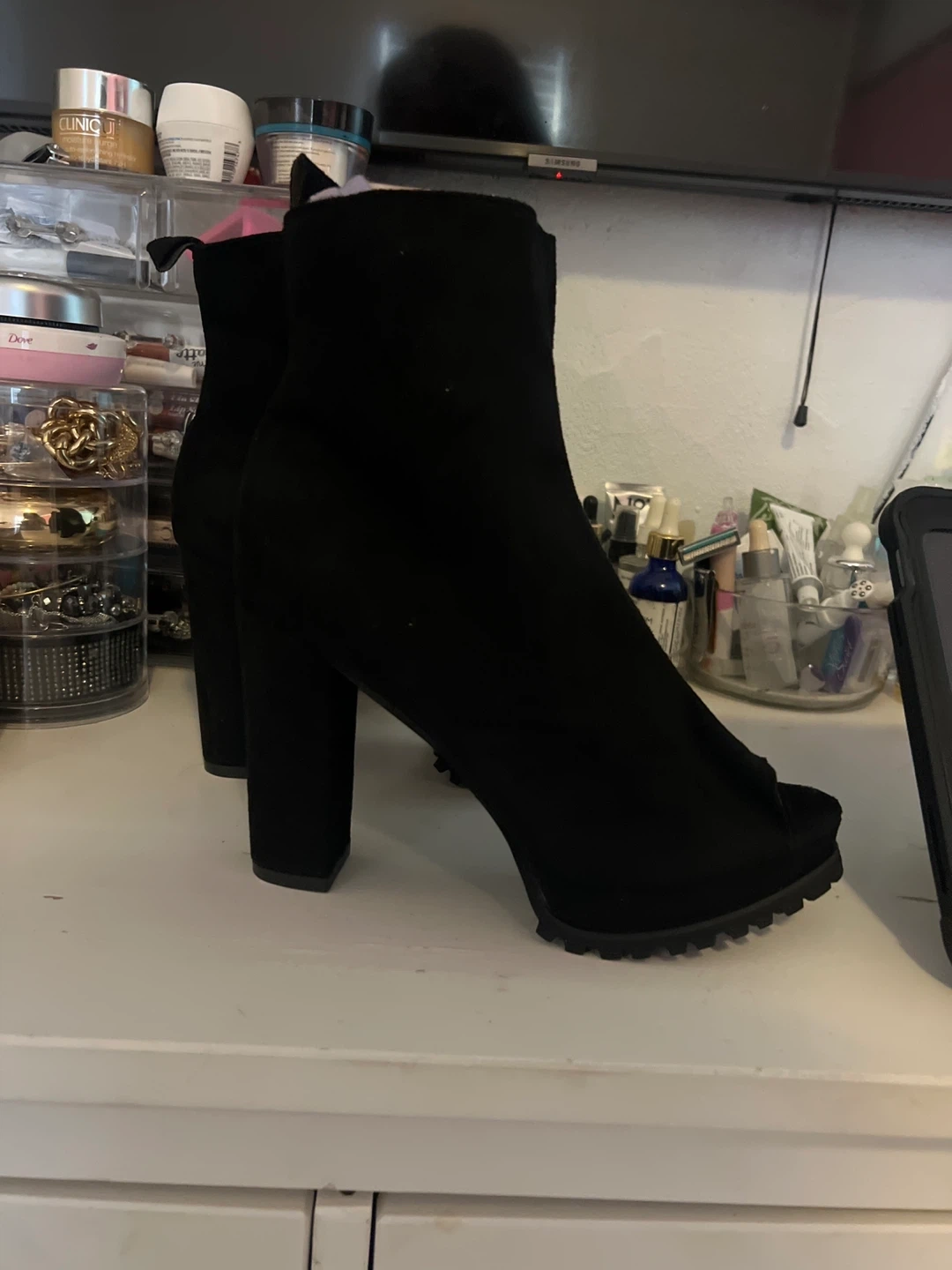 Selling a pair of black peep-toe platform booties. These are in good condition and ready for a new owner! They are a stylish addition to any wardrobe