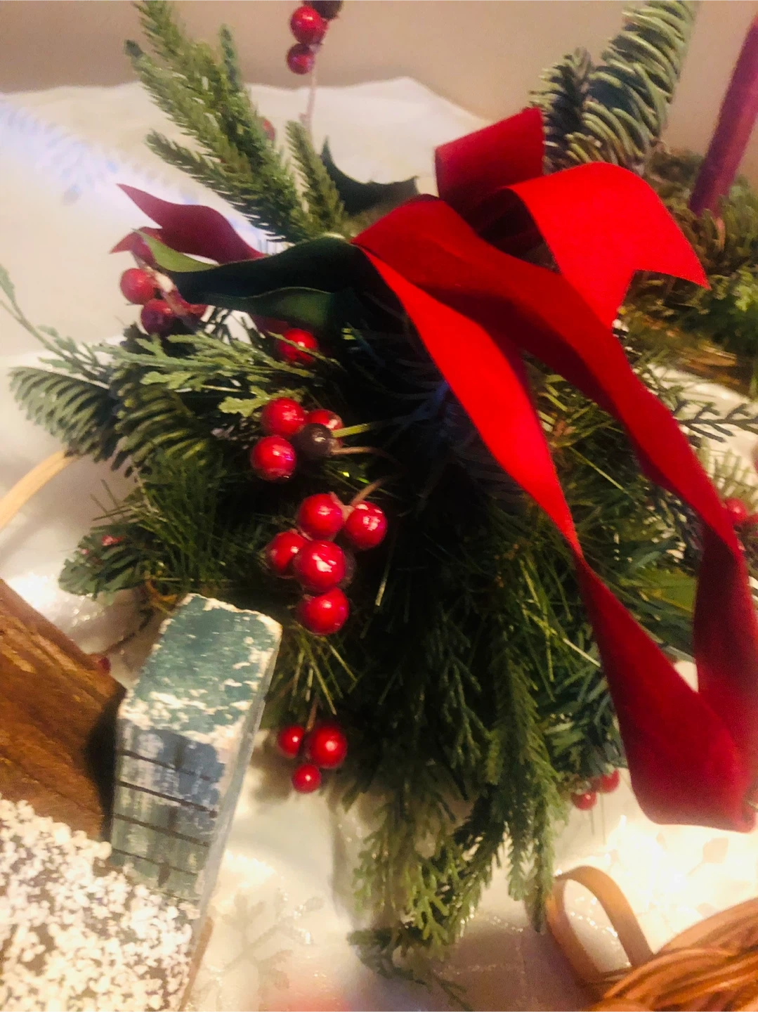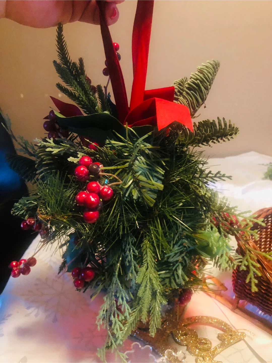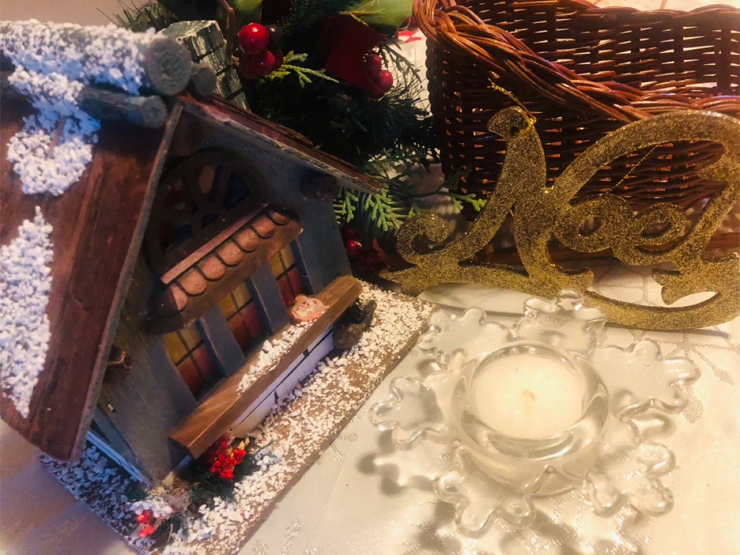 AND A Glass Snofkake Candle Holder with Candle, A Hanging Mistletoe Greenery Ball and a Glittering Noel Decoration!