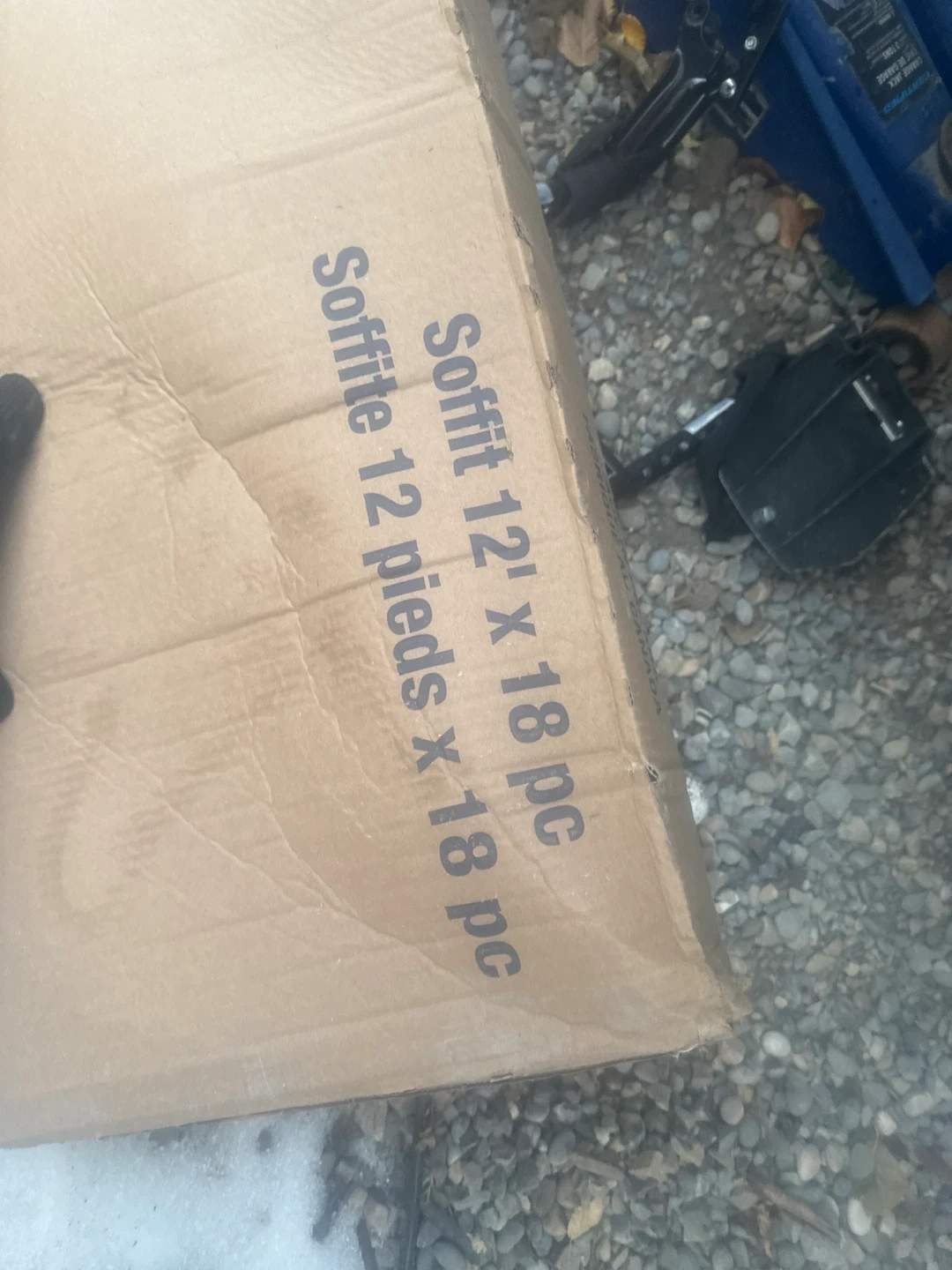 Selling a box of Royal Building 4 Panel Classic Soffit in black. Each panel measures 18 x 12 feet. The box includes 18 pieces. The manufacturing date is 2025 August 21