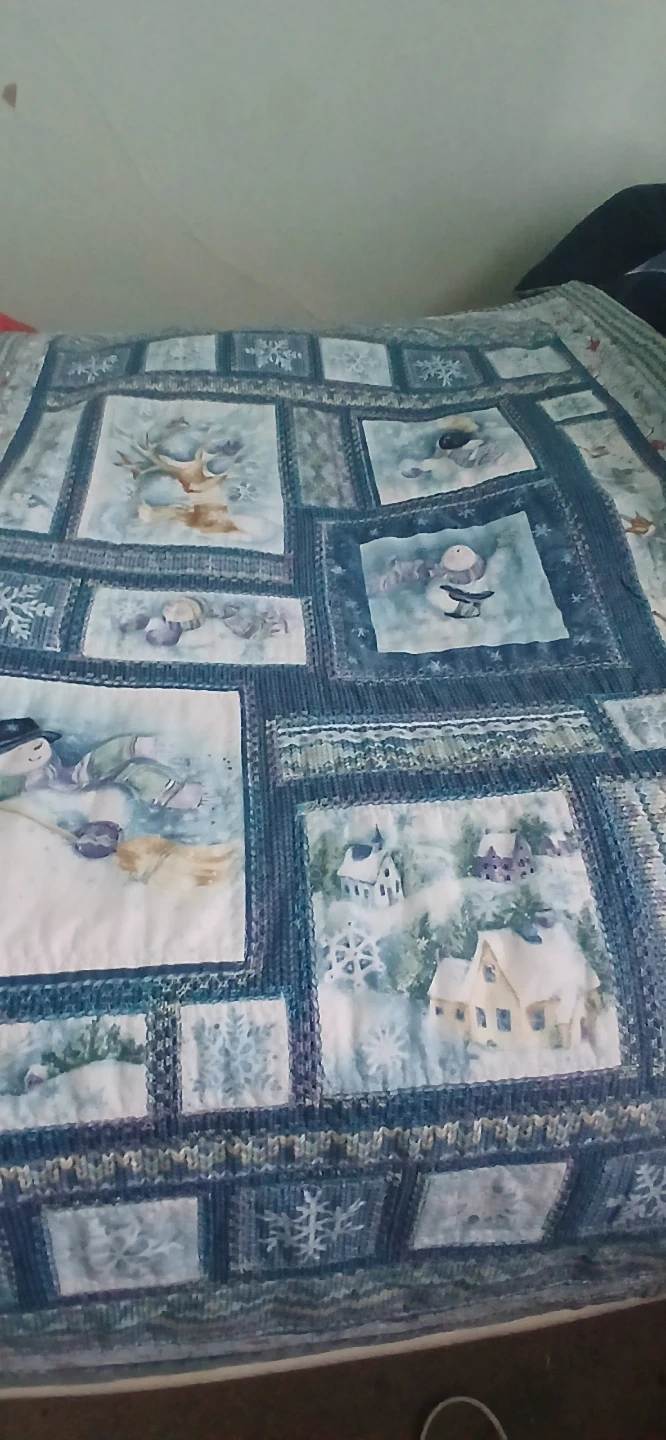 Here's a lovely quilt featuring a winter scene with snowmen, reindeer, and houses. The quilt has a patchwork design with various winter-themed images. It has a blue and white colour scheme.