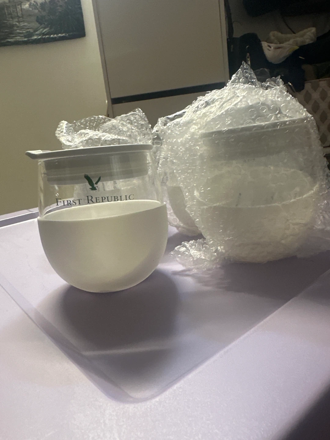 Selling a brand new First Republic Bank glass cup! It's still in its original packaging and has never been used. Perfect for adding a touch of elegance to your drinkware collection