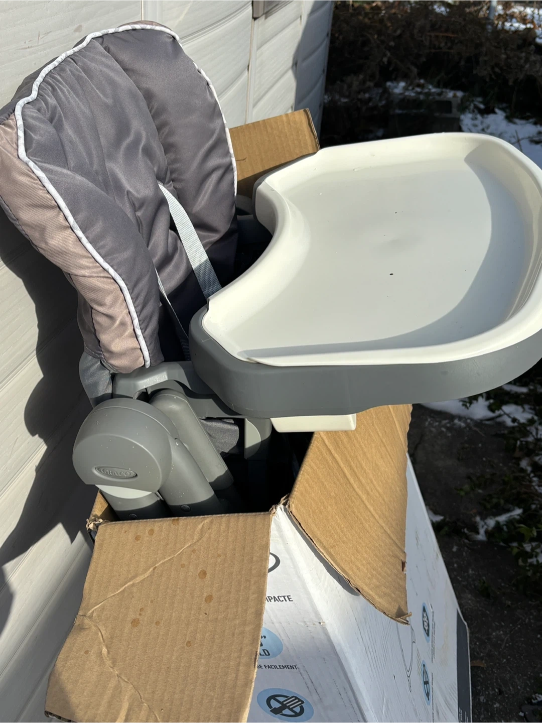 Selling a Graco Slim Spaces high chair. It's in great condition and comes with the original box! It folds up compactly for easy storage, with a slim 8.5" fold