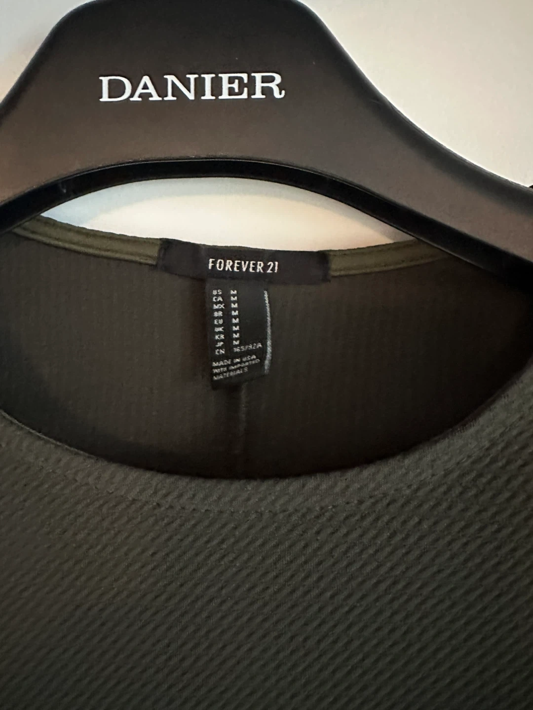Selling a Forever 21 dress in olive green! It's a size medium and has short sleeves. The material has a subtle textured pattern. It's in great condition and ready for a new wardrobe addition