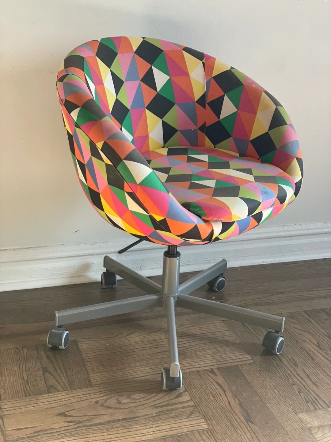 Selling a fun and colorful swivel chair! It has a unique geometric pattern that would add a pop of brightness to any room. The chair is in good condition and ready for a new home office or creative space. Has a couple of coffee and acrylic spots, coming from an artists studio. Can’t beat the price, first come first serve.