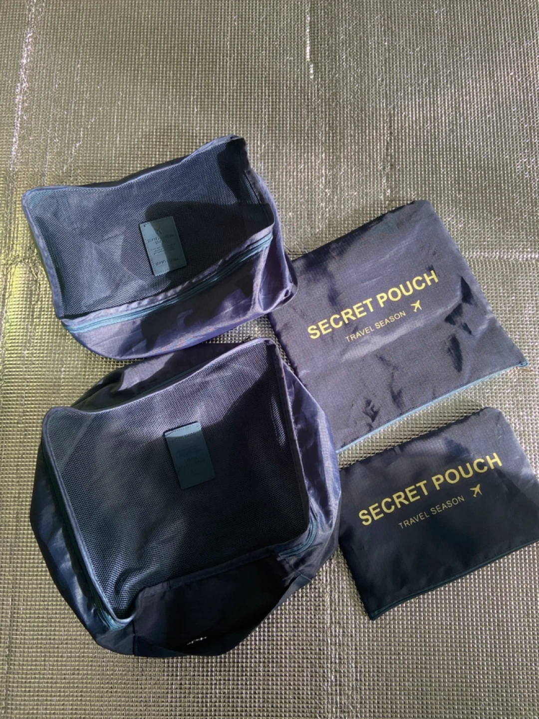 Selling a set of travel organizer pouches in navy blue. They say 'Secret Pouch Travel Season' on them. Great for keeping your luggage organized!
