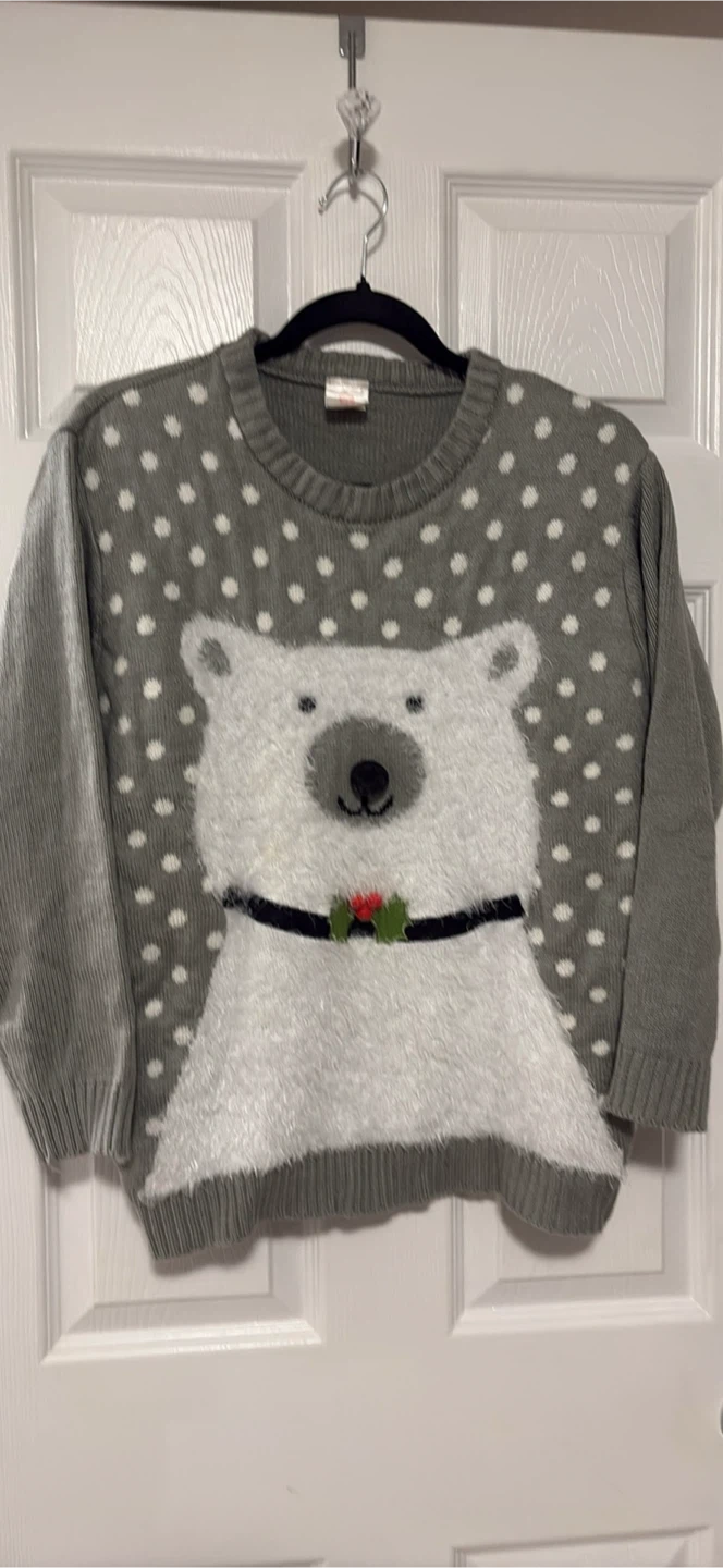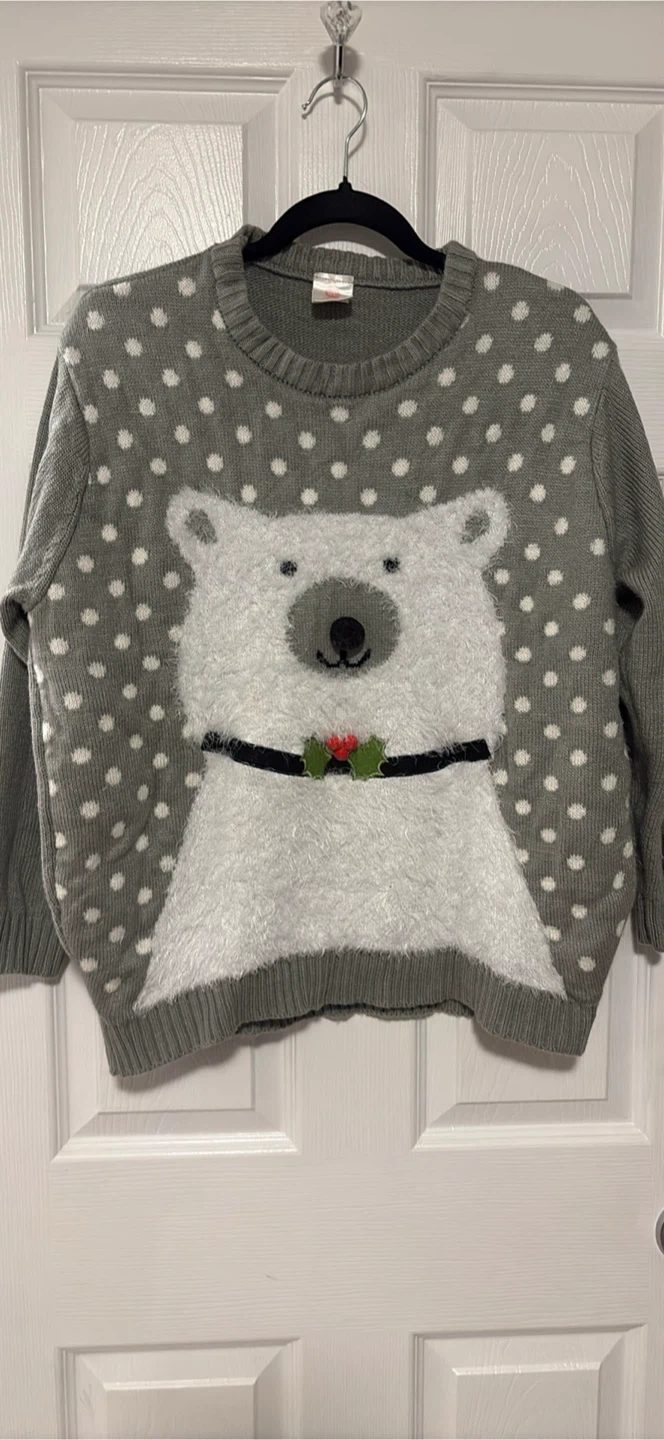 Super cute polar bear sweater! It features a grey background with white polka dots and a fluffy white polar bear design on the front. Perfect for the holidays! Size xl pick up walnut grove Langley