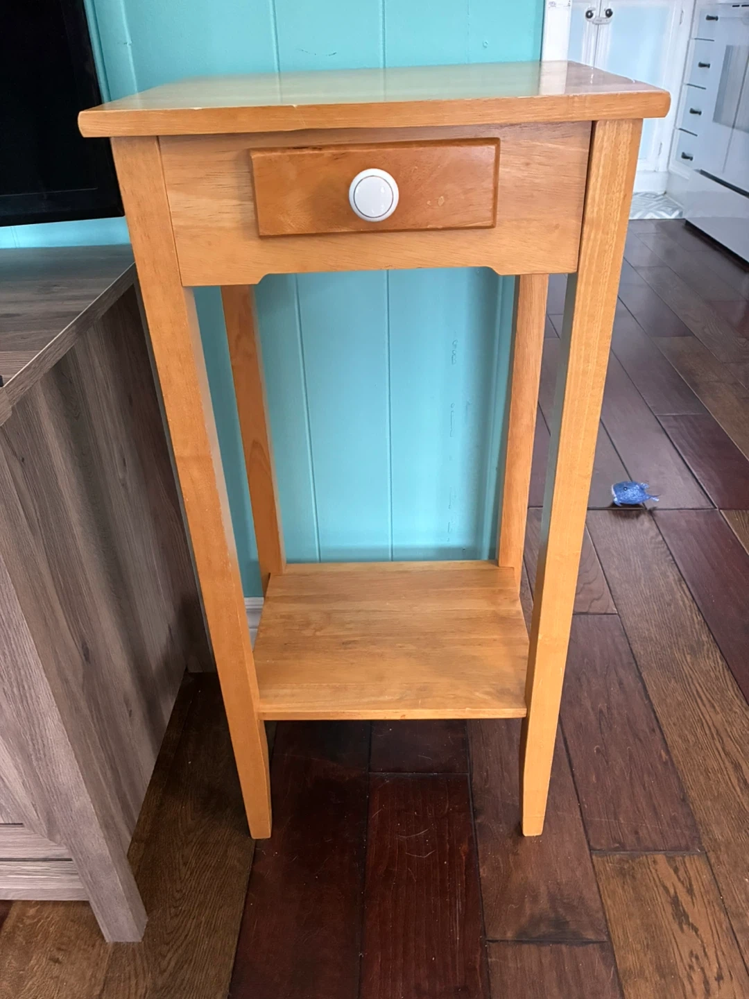 A cute little wooden side table with a handy drawer and a shelf at the bottom. It's perfect for a small space or as a bedside table. The drawer has a white knob. It's in good condition and ready to add some charm to your home!