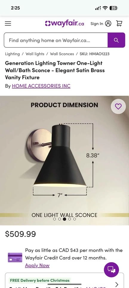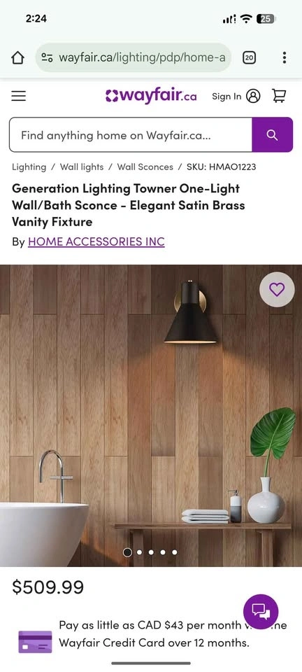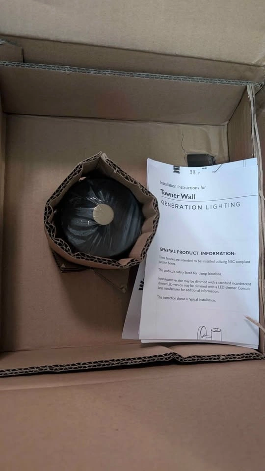Selling 1 Generation Lighting Towner One-Light Wall/Bath Sconce - Elegant Satin Brass Vanity Fixture. Perfect condition, still in box! Market Wayfair price = 500 CAD+ Taxes. Asking price = 70 CAD. The Towner One-Light Wall/Bath Sconce from Generation Lighting combines mid-century modern charm with a retro-inspired design. Featuring a bold, circular silhouette, this vanity fixture makes a striking statement in any room. The conical light shade adds a unique touch, while the textured cloth cords are adjustable for perfect levelling. Ideal for use in the dining room, living room, or kitchen, this fixture offers both style and practicality. It’s energy-efficient, safe for damp locations, and comes in a beautiful satin brass finish. Mounting hardware is included for easy installation, making it a hassle-free upgrade for your space. Satin brass finish with black steel shades for a warm, comforting glow. Includes 6.5" lead wire for easy DIY installation. Dimensions: 8 x 7 x 8.375 inches, perfect for any room. Energy-efficient when used with JA8 certified bulbs, meeting California Title 24 standards. ETL listed, safe for use in damp locations like kitchens and bathrooms.