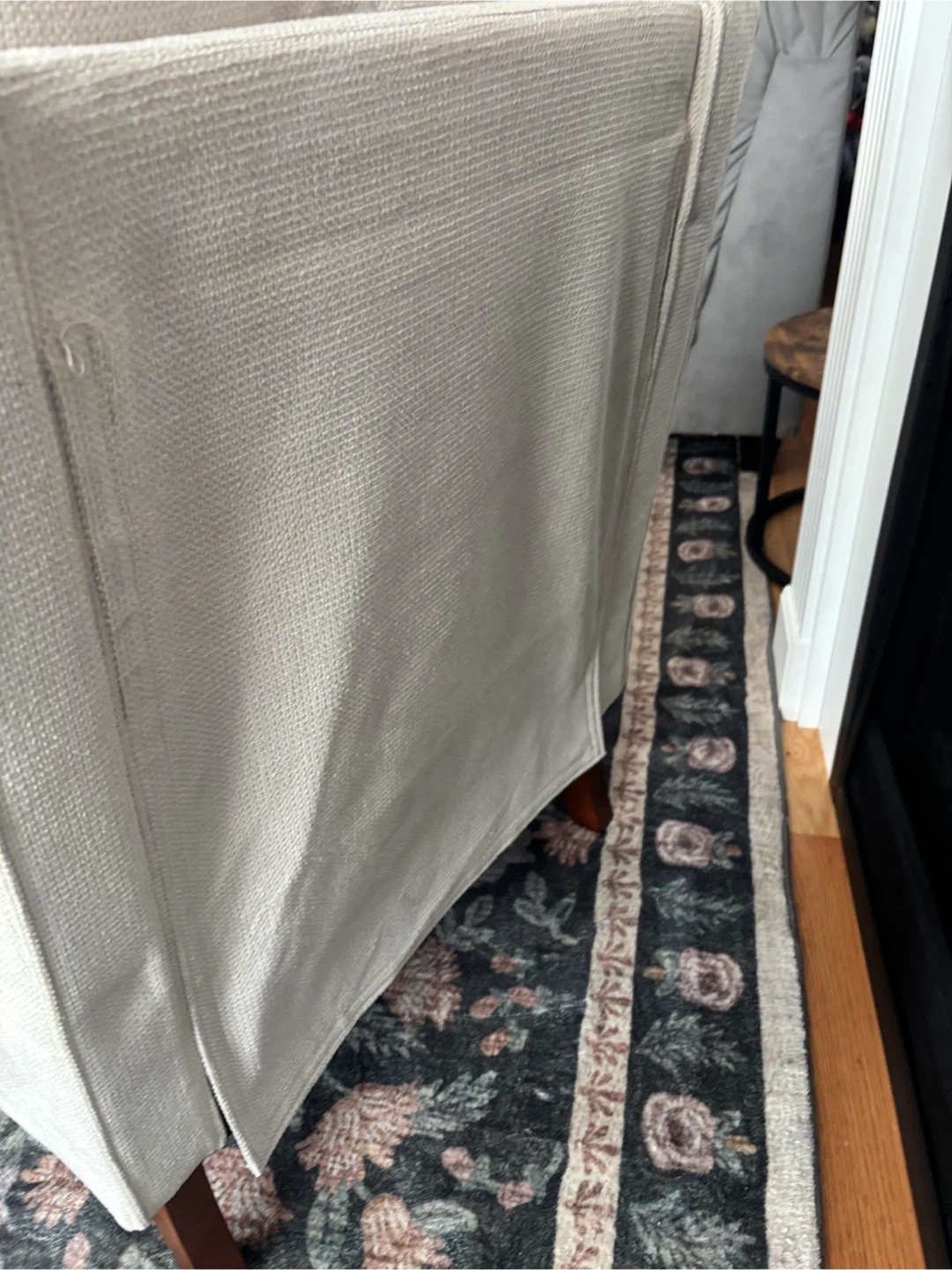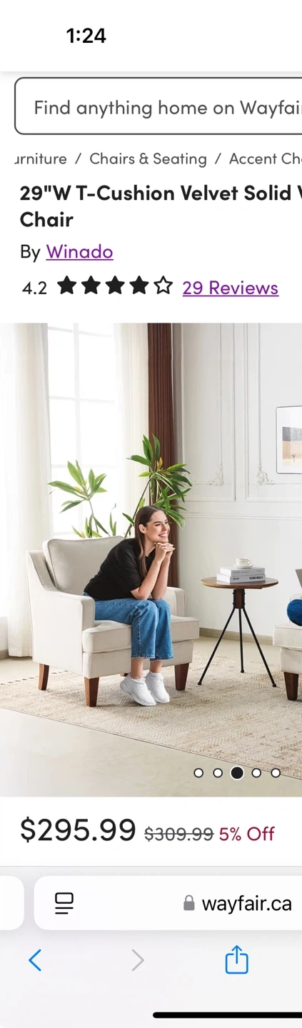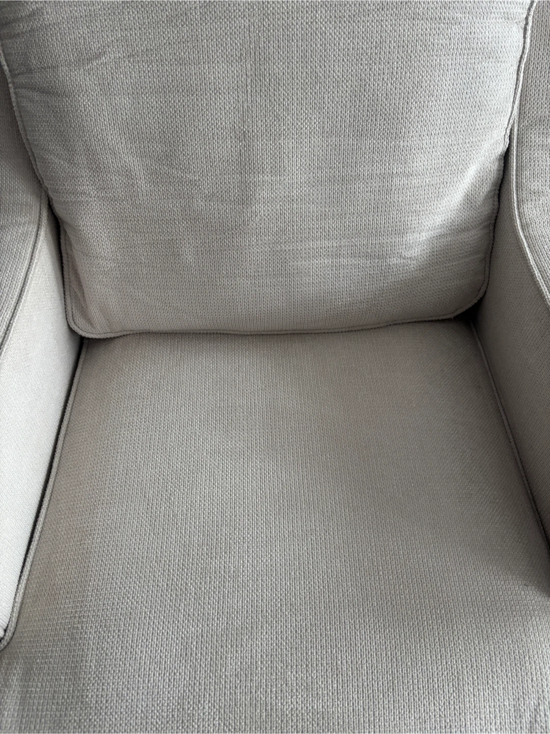 This is a comfy beige accent armchair! It's in great shape and would look great in any room.