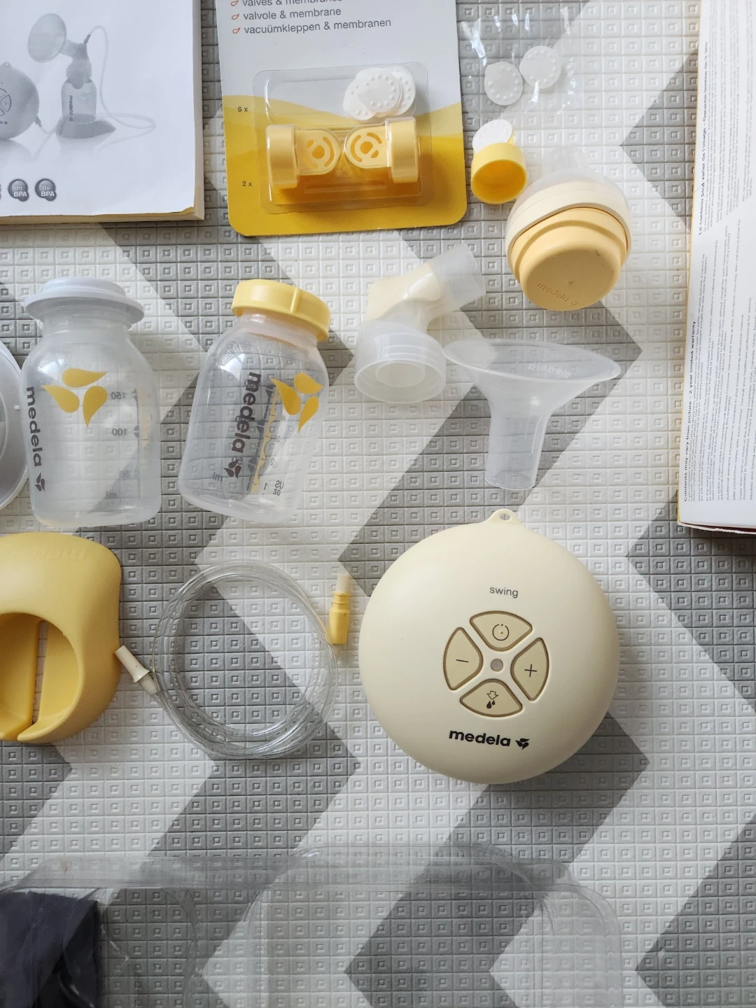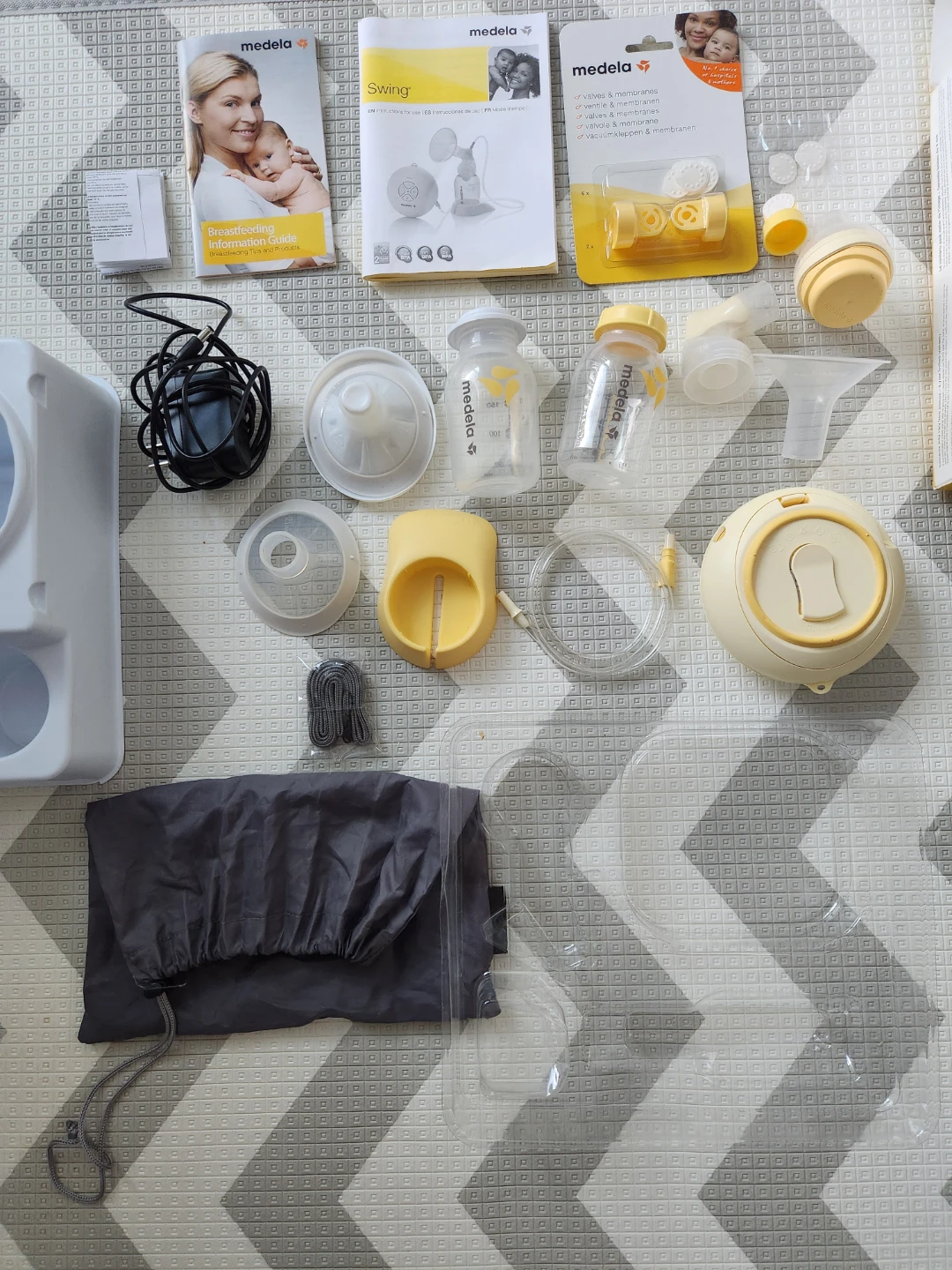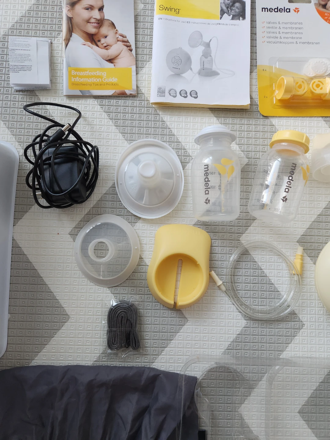 Selling a Medela Swing single electric breast pump. Like new!Comes with all the parts as per photos. Bottles not used for feeding baby. Tryed the pupm only once. Valves and membranes are new (unopened package) - just them alonr are currently sold on Amazon for $11! Also included is a breastfeeding information guide. Comes with the original box/packaging