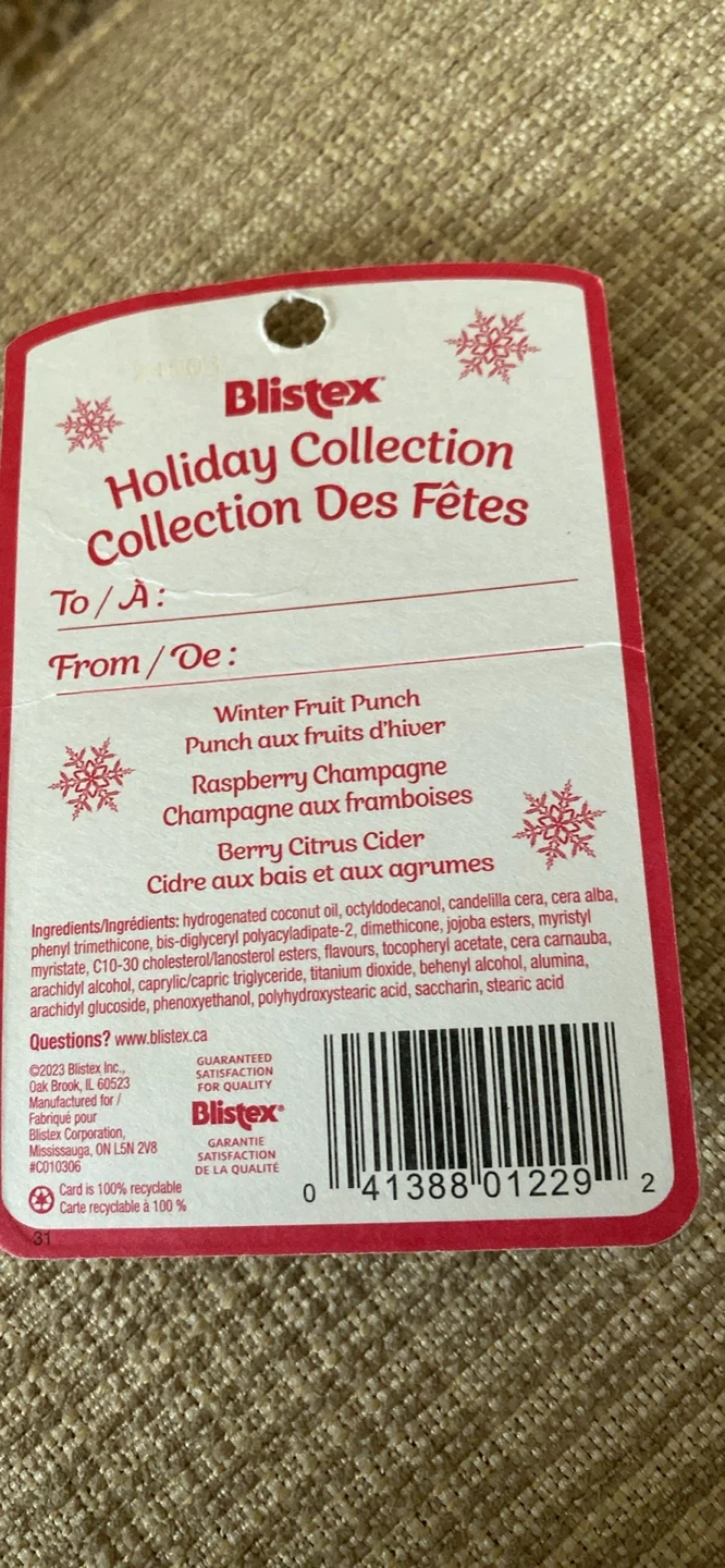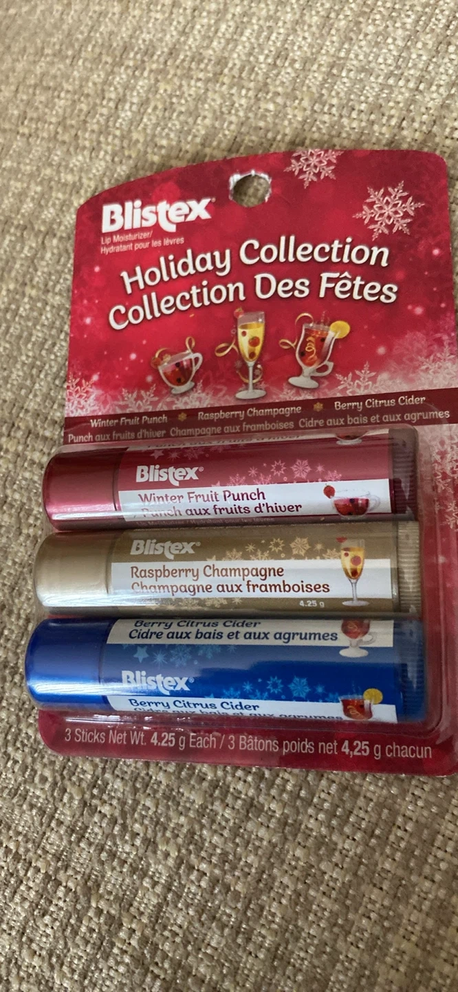 Selling a new Blistex Holiday Collection lip moisturizer set! It comes with three different flavours: Winter Fruit Punch, Raspberry Champagne, and Berry Citrus Cider. Perfect for keeping your lips moisturized this winter season!