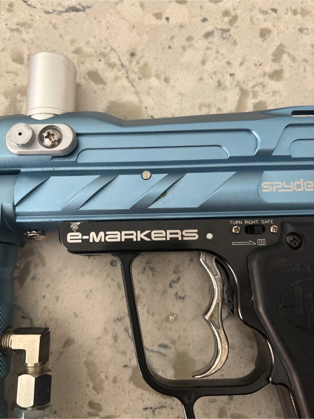 Selling a Spyder e-marker paintball gun in a cool blue colour! It's in good condition and ready for some action. Perfect for paintball enthusiasts looking for a reliable and fun marker.