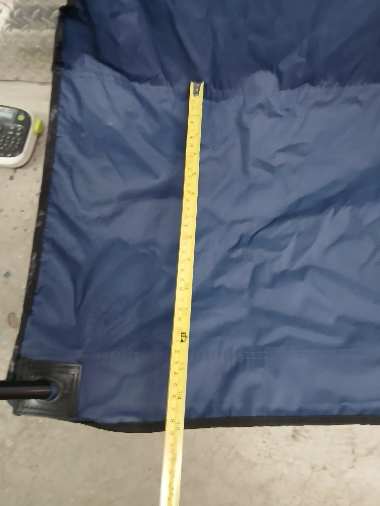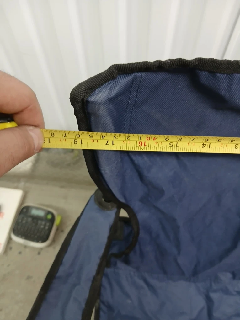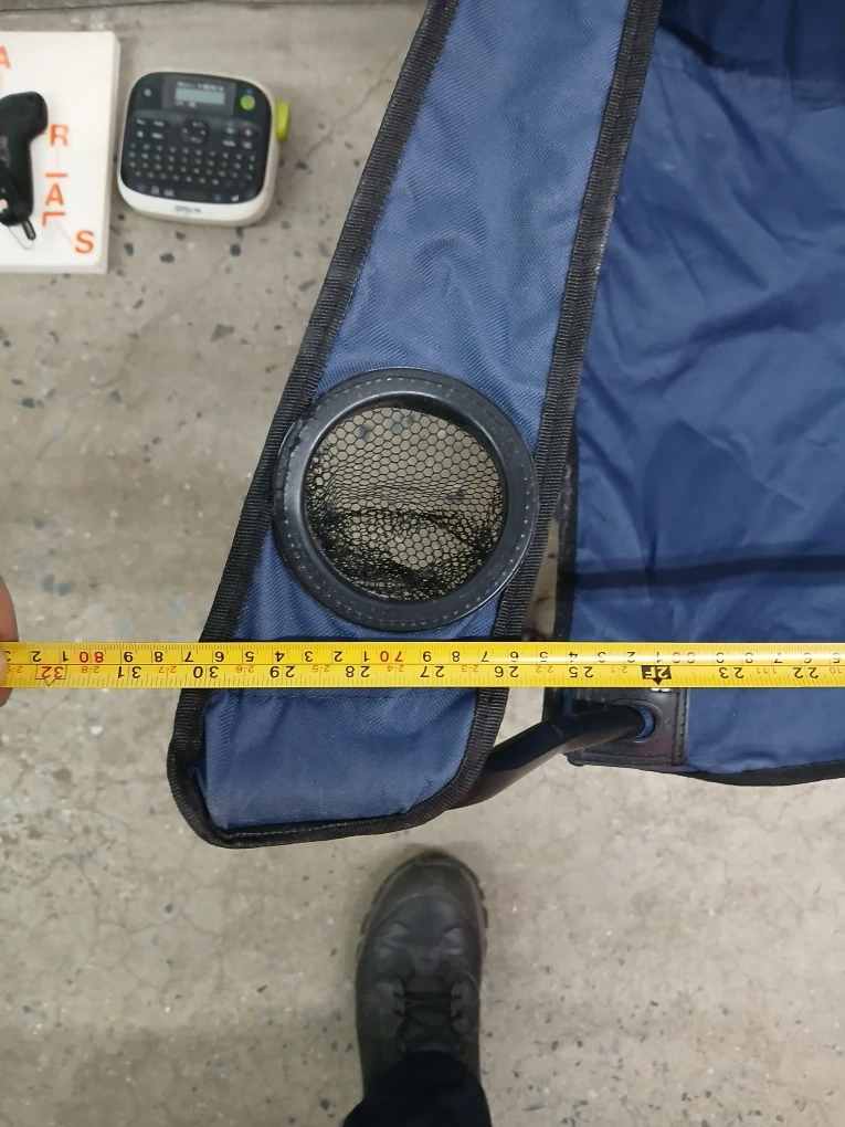 This is a blue folding camp chair that's perfect for outdoor activities! It includes a convenient cup holder. The chair measures approximately 31 inches in height and 17 inches in width.
