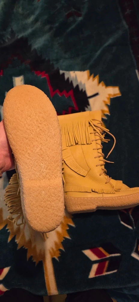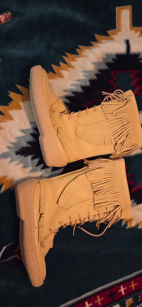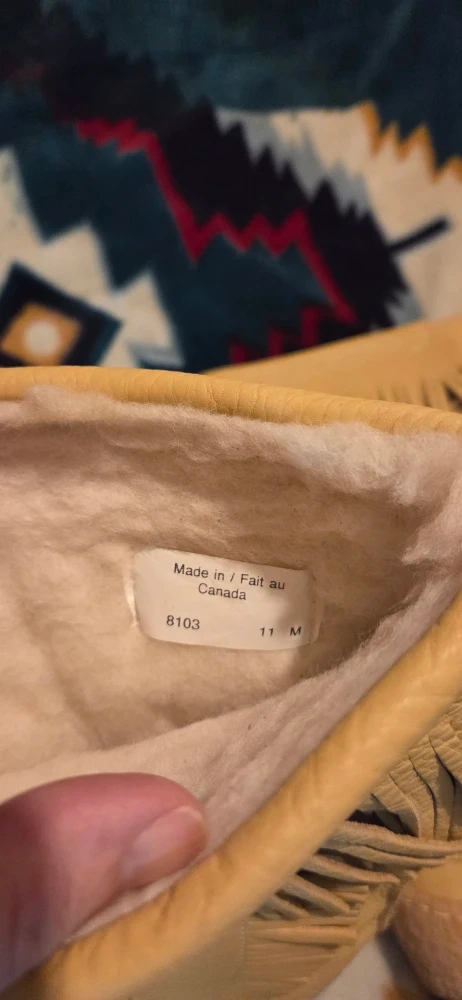 Selling a pair of handmade moccasin boots, made in Canada! They're a size 11M and feature a unique fringed design. Perfect for adding a touch of Canadian style to your wardrobe