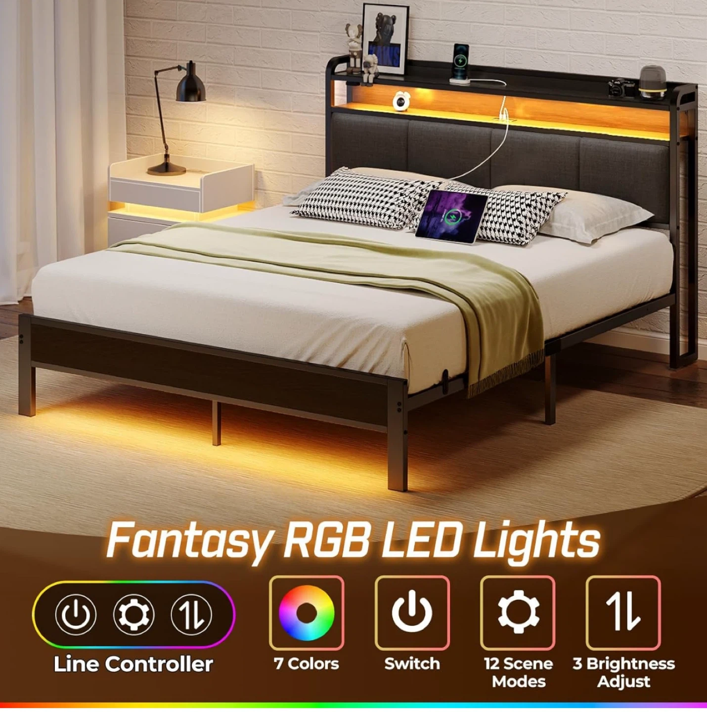 Check out this brand new full-size bed frame! It features a storage headboard with a charging station, perfect for keeping your devices powered up. The RGB LED lights add a fun touch with 7 colours, 12 scene modes, and 3 brightness adjustments. It's easy to assemble with its bolt-free system and has a steel baffle design to prevent mattress sliding. Dimensions are 82.2" x 54.8" x 42.4".