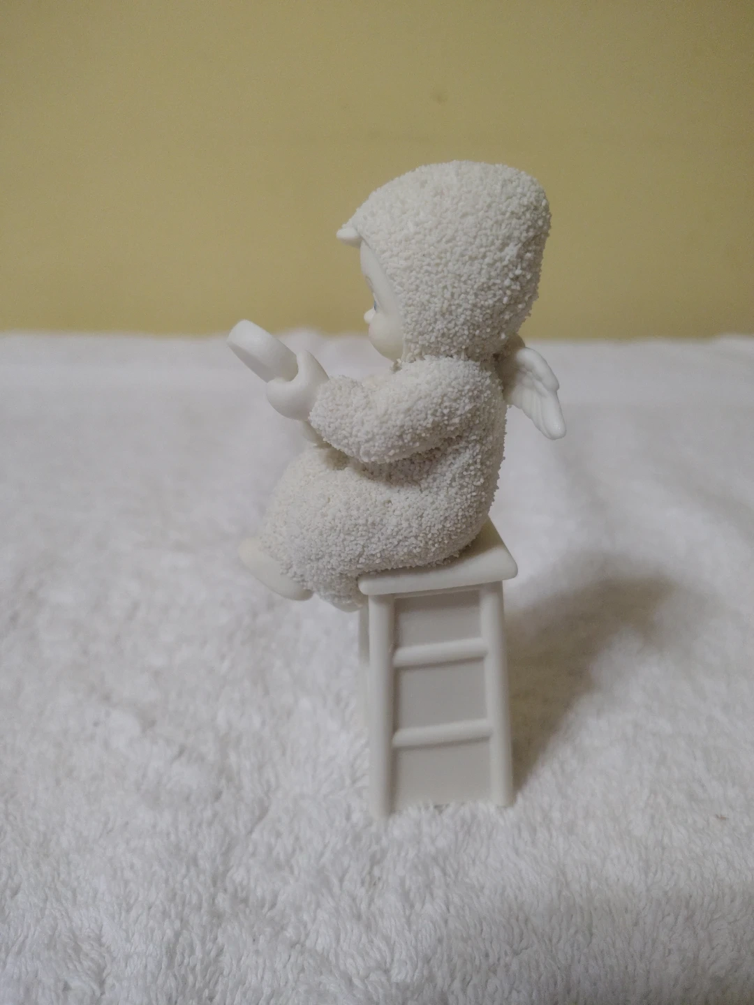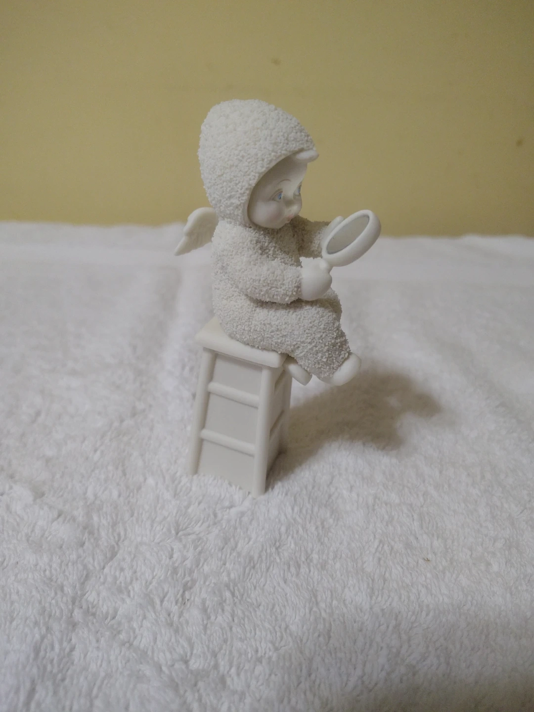 This is a Snowbabies figurine titled "Making My Entrance" featuring a baby angel sitting on a stool while holding a mirror. It's in great condition and would be a lovely addition to any collection!