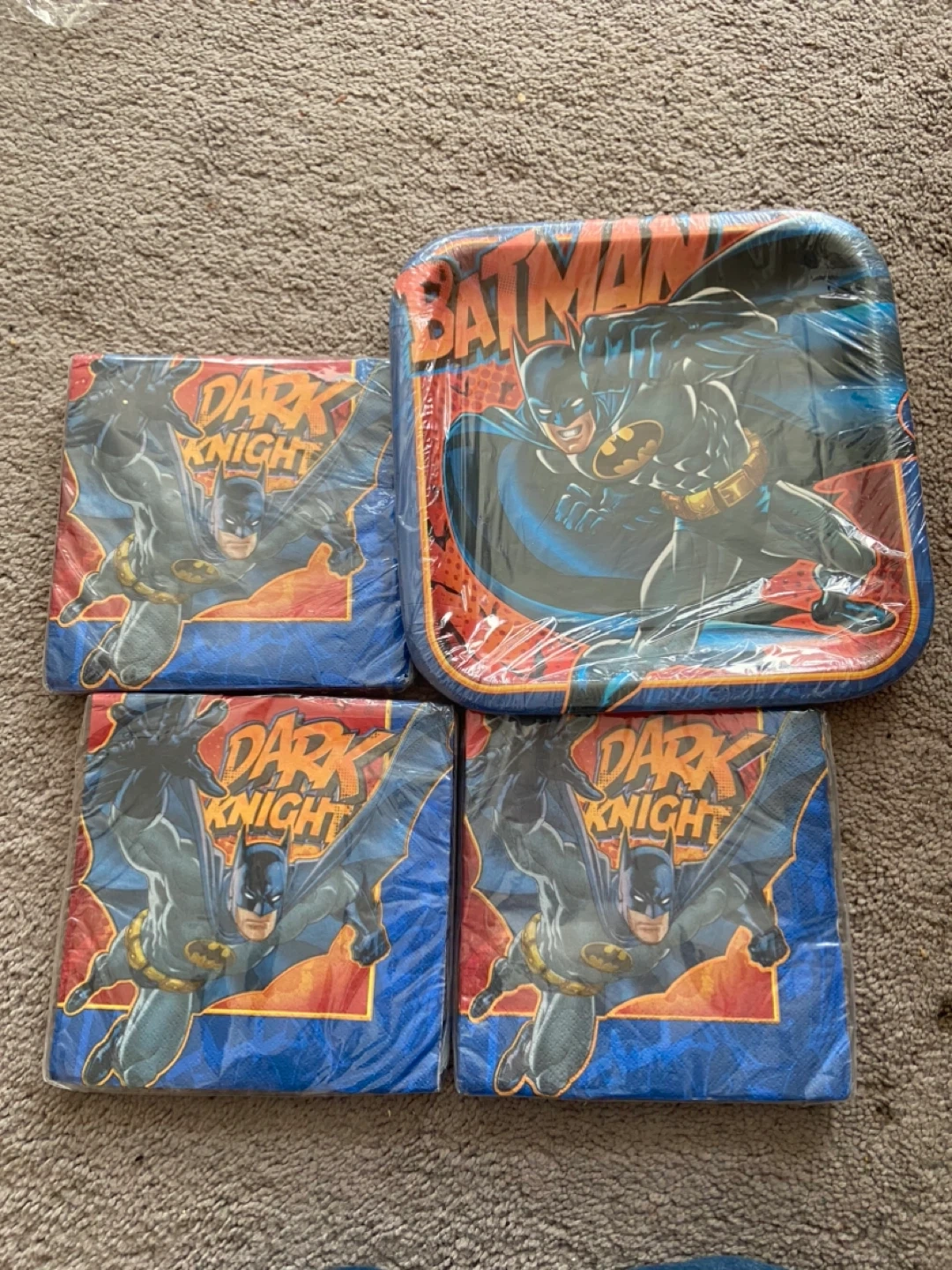 I have a brand new set of Batman themed party supplies! This includes 8 plates (9.14 x 9.14 in / 23.49 x 23.49 cm) and 3 sets of 16 napkins (12.6 x 12.6 in / 32.2 x 32.5 cm). Perfect for a Batman birthday party or themed event