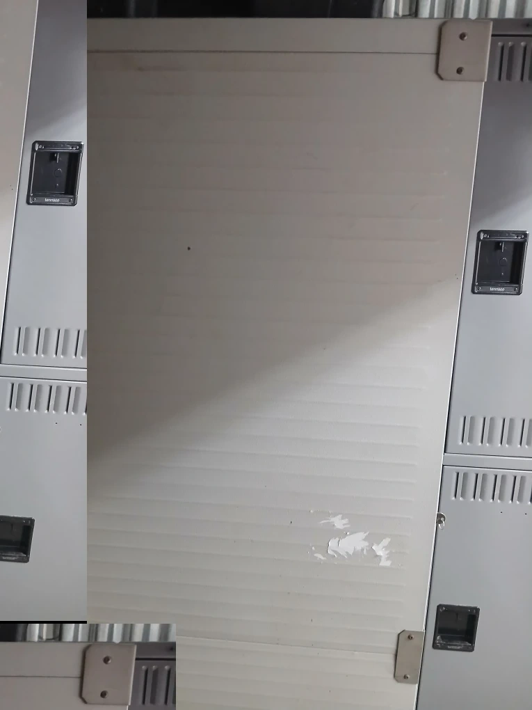 Here's a storage cabinet, perfect for organizing your space! It features a roll-up door and adjustable shelves, providing versatile storage options. The cabinet appears to be in good condition and ready to use