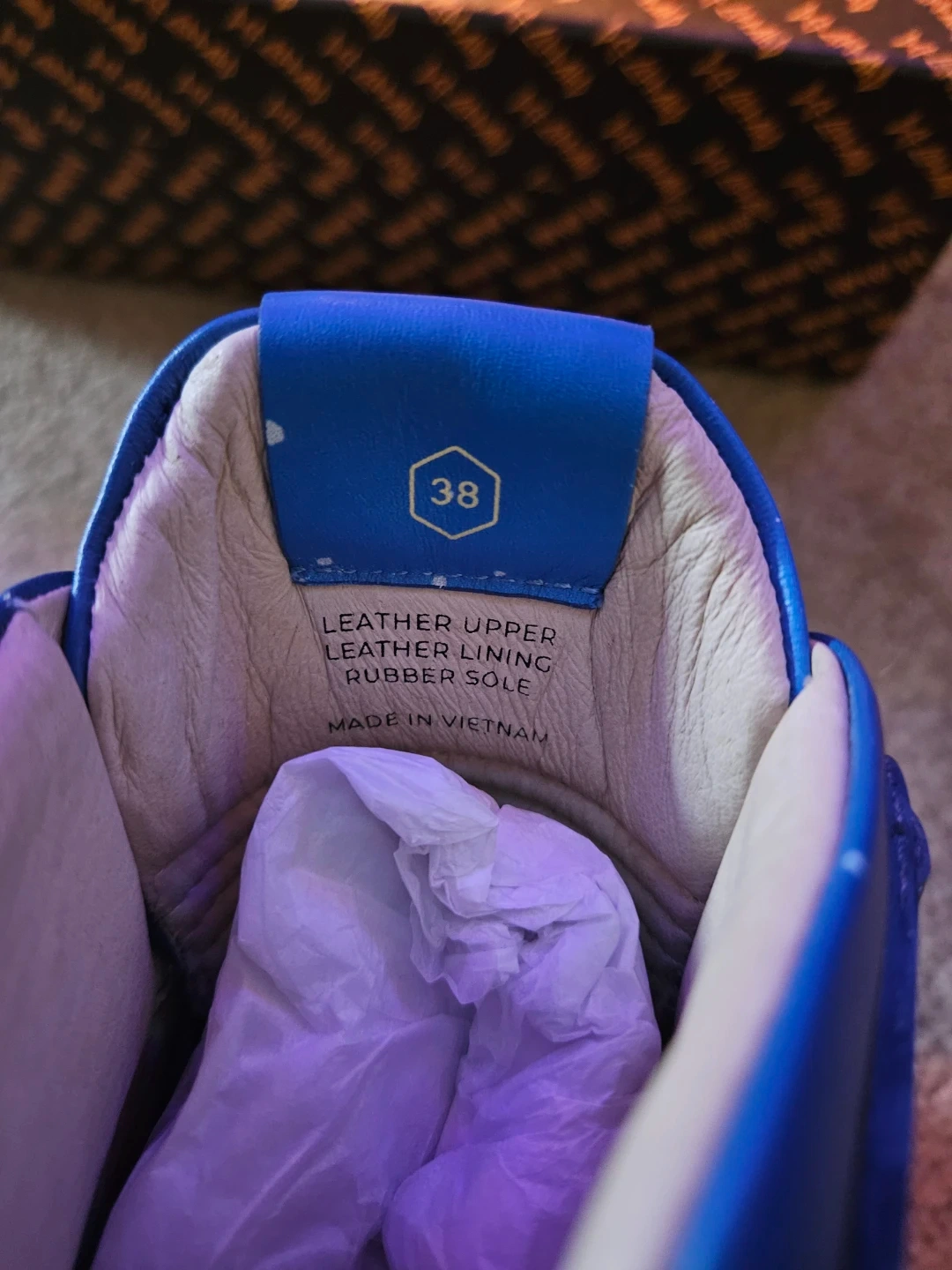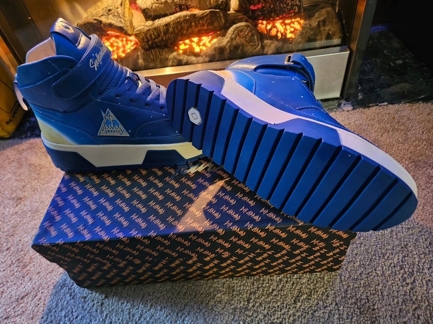 Selling a pair of Sixhundredfour Sapphire Def Lepard high-top sneakers! They're a beautiful blue colour with a unique design. The size is 38. The upper and lining are leather, and the sole is rubber. They come with the original box!