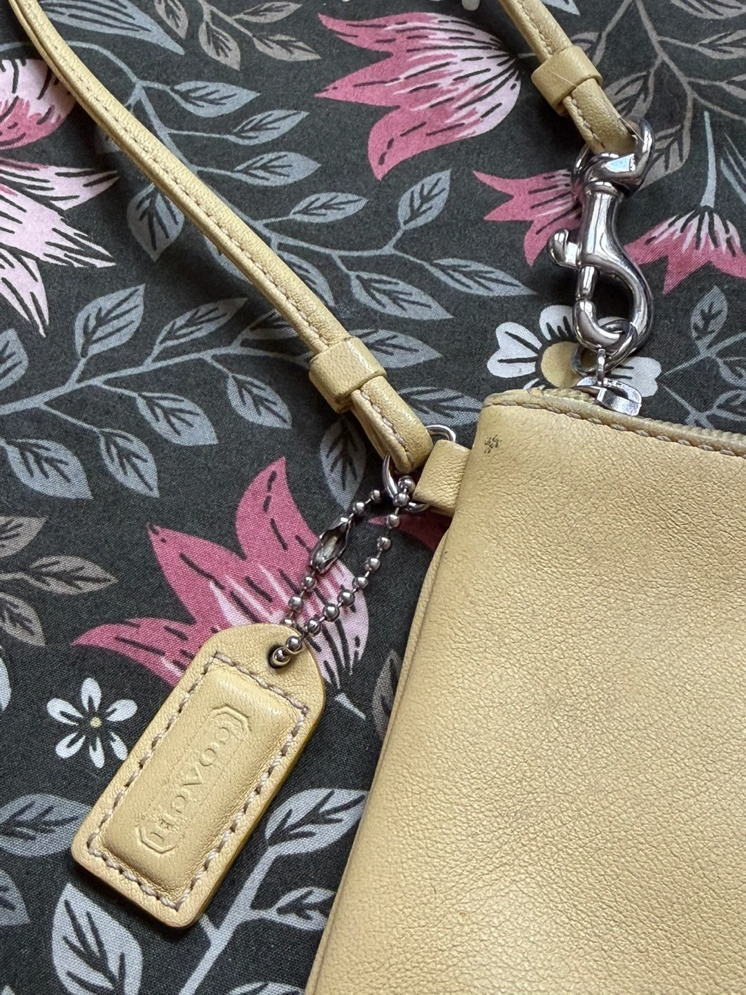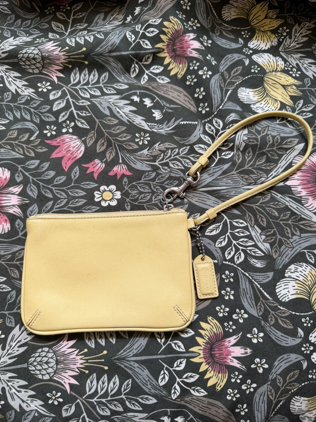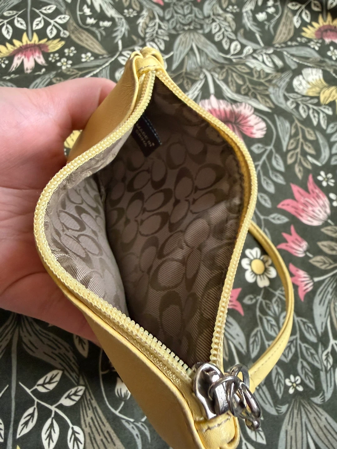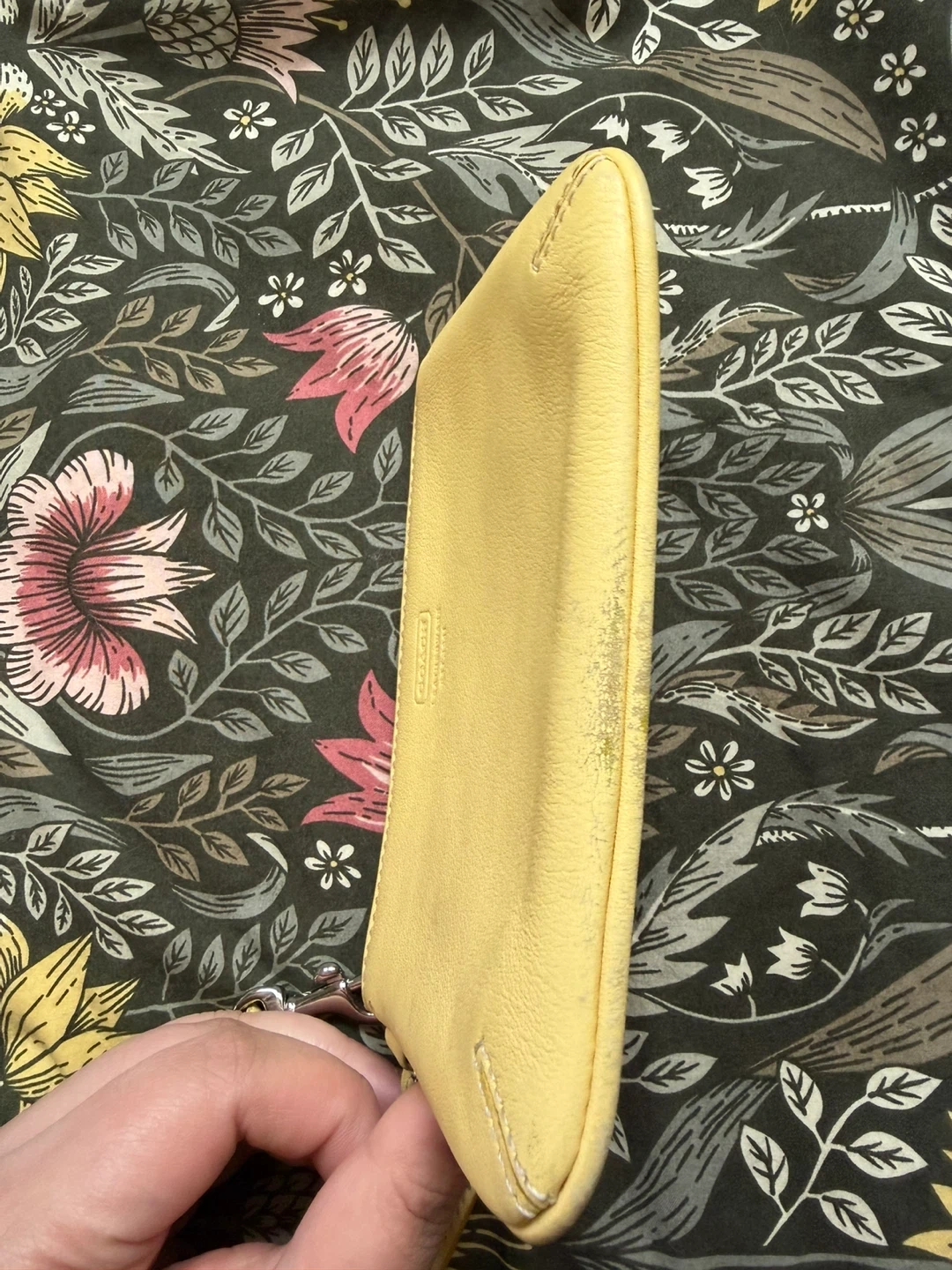 Chic and versatile yellow leather wristlet clutch, perfect for any occasion. Features a sleek design with a convenient wrist strap.