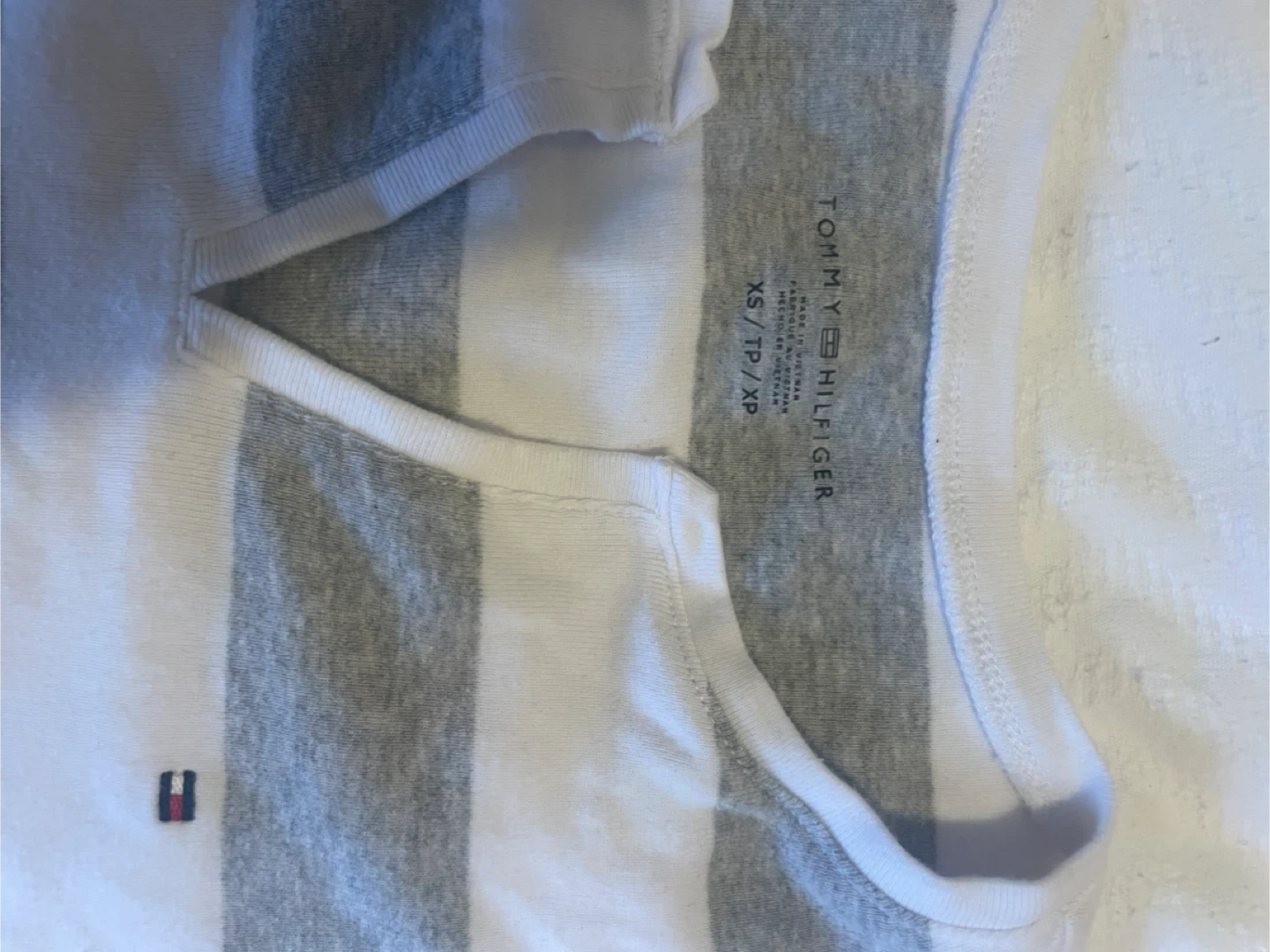 Here's a cute Tommy Hilfiger tank top! It features a striped pattern in white and grey. The size is XS.