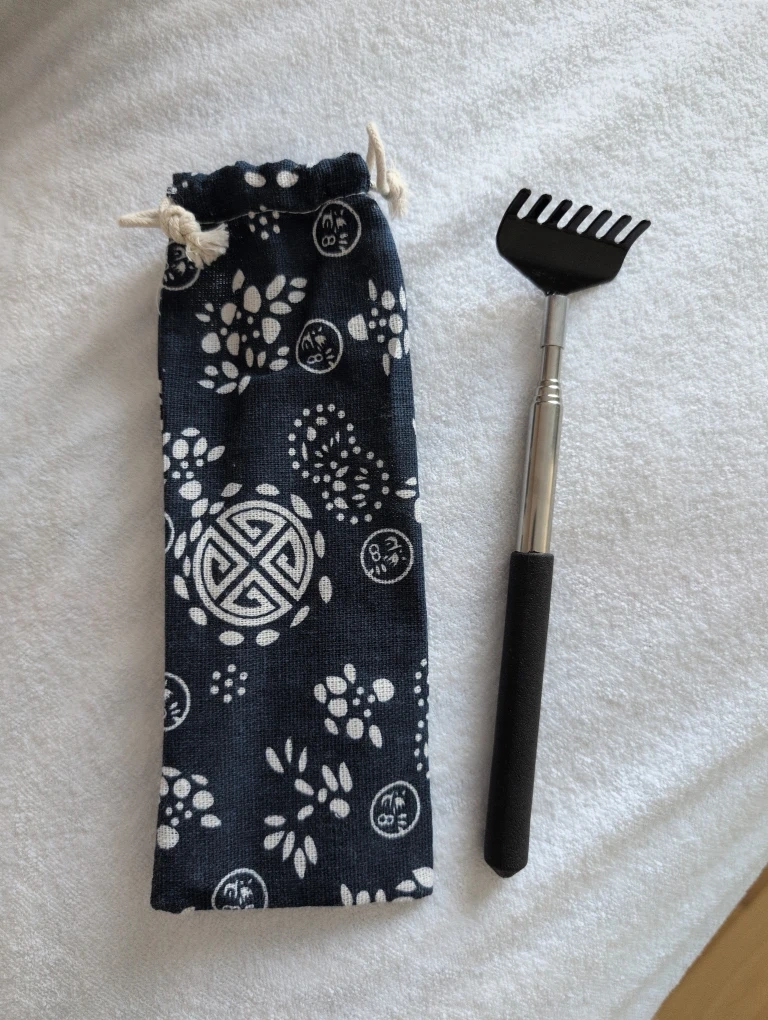 This is a handy extendable back scratcher that comes with its own carrying pouch! It's perfect for reaching those hard-to-get spots. The scratcher is in great condition and ready for a new owner. The pouch has a nice design on it too!