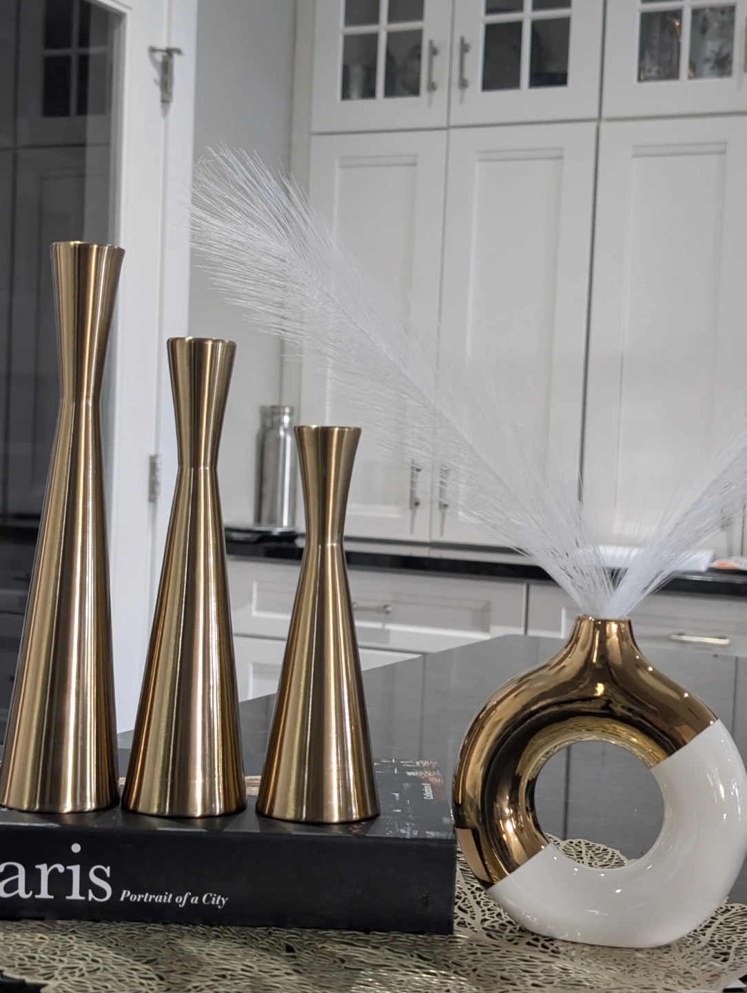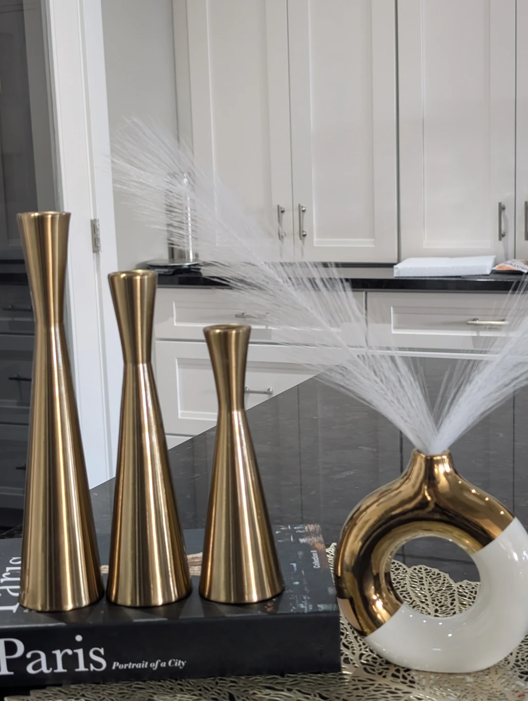 Here's a lovely set of gold candle holders and a decorative vase to add a touch of elegance to your home. The candle holders have a sleek, modern design, and the vase is a unique piece that will surely catch the eye. They're brand new and ready to brighten up any room!