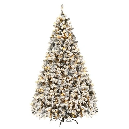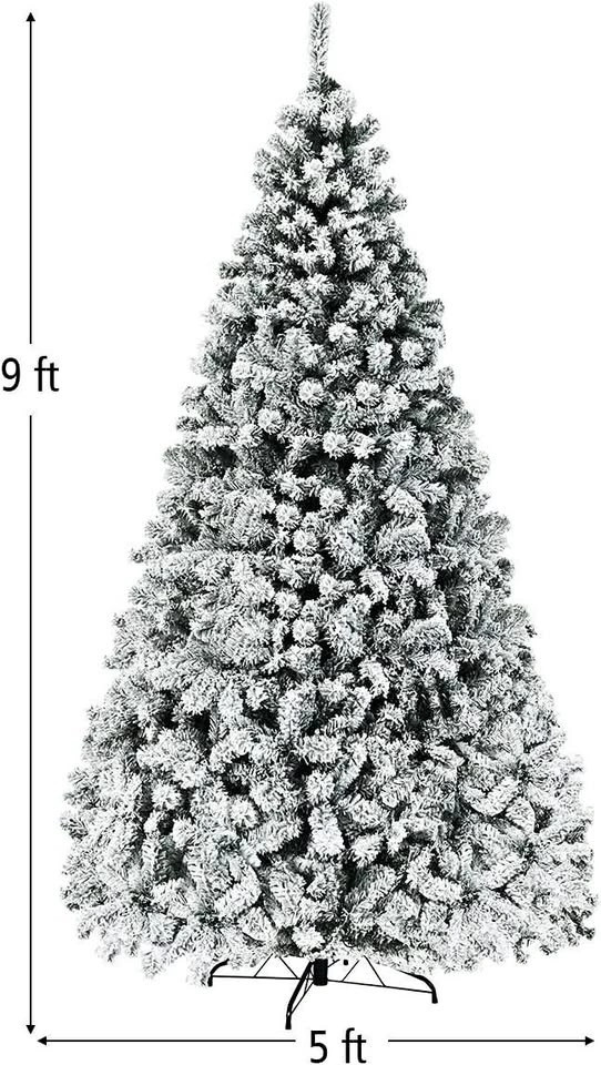 Brand new condition. This product is 100% brand new, unused, and in original condition. With many branch tips and snow-flocked leaves, this tree just like a real tree perfectly kissed by snow, making it an eye-catching decoration during the holidays. It is crafted of non-flammable PVC material, which is resistant to pressure and not deformed easily for a long lifespan. Iron stand makes the tree stable without tilting. Product Dimensions 152D x 152W x 274H Centimetres Material Metal, Polyvinyl Chloride Item weight 33 Pounds With 550 warm LED lights, our snow flocked tree is sure to capture attention day and night. The thoughtful design ensures that your home is illuminated and cozy during the cold winter months. Rest assured, the tree comes with a UL-approved plug, guaranteeing safety during use. The Christmas tree is crafted from high-quality PVC and boasts 1498 dense branch tips, offering the same durability and safety as a real tree. The charming flocked snow leaves add a touch of realism, creating the appearance of a tree dusted with snow. The lush green branches also provide ample space for you to showcase your favorite decorations. Unlike flimsy plastic bases, our Christmas tree is equipped with a sturdy metal stand, ensuring stability and security. You can trust that it will remain upright even with minor bumps, providing peace of mind throughout the holiday season. Whether it's for home gatherings, offices, or shopping centers, our Christmas tree is the perfect centerpiece. Adorn it with your favorite Christmas ornaments such as bells, Santa Claus figures, gingerbread men, or other festive decorations to create a joyful atmosphere. Our pre-lit Christmas tree will make your holiday season complete and unforgettable. The fully hinged structure of our Christmas tree makes assembly a breeze. Save time and effort as it expands effortlessly. Customize the branches to your liking to create a fuller, more beautiful tree. When it's time to put it away, simply disassemble the tree into 4 parts and return it to the original box for convenient storage.