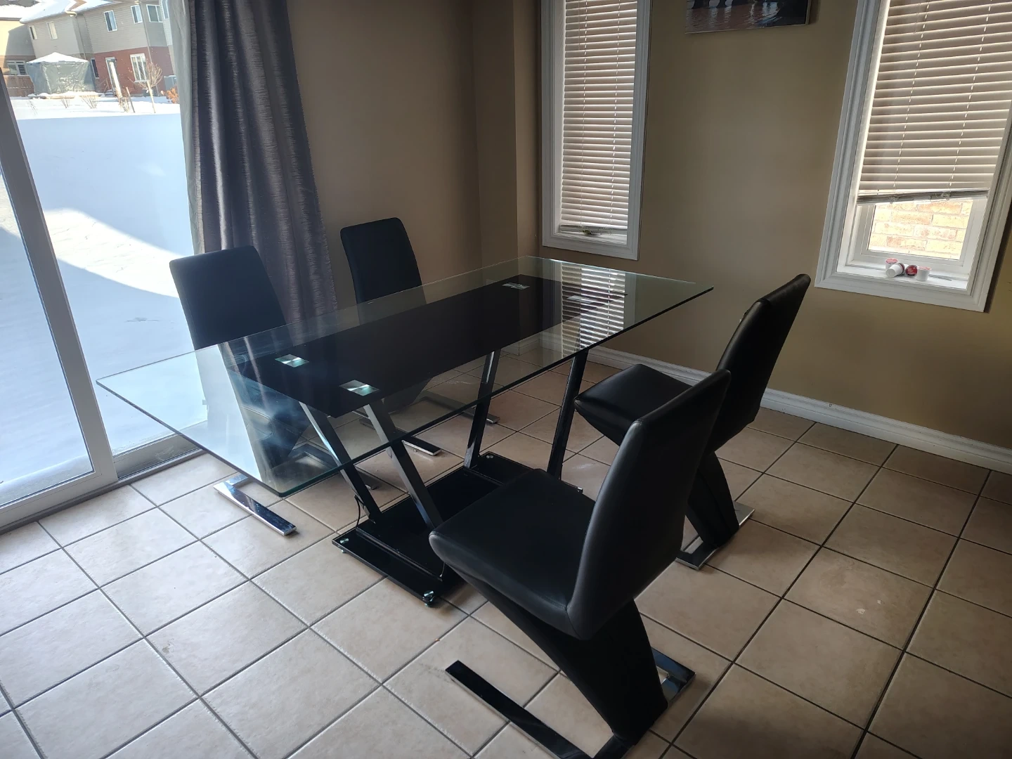 Selling a dining table with a glass top and four chairs. The chairs are black. This set would be a great addition to any dining room or kitchen!
