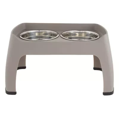 This is a gray adjustable height double dog bowl stand. It's perfect for dogs of all sizes and helps them eat comfortably! The bowls are stainless steel and easy to clean. It's in great condition and ready for a new furry friend!
